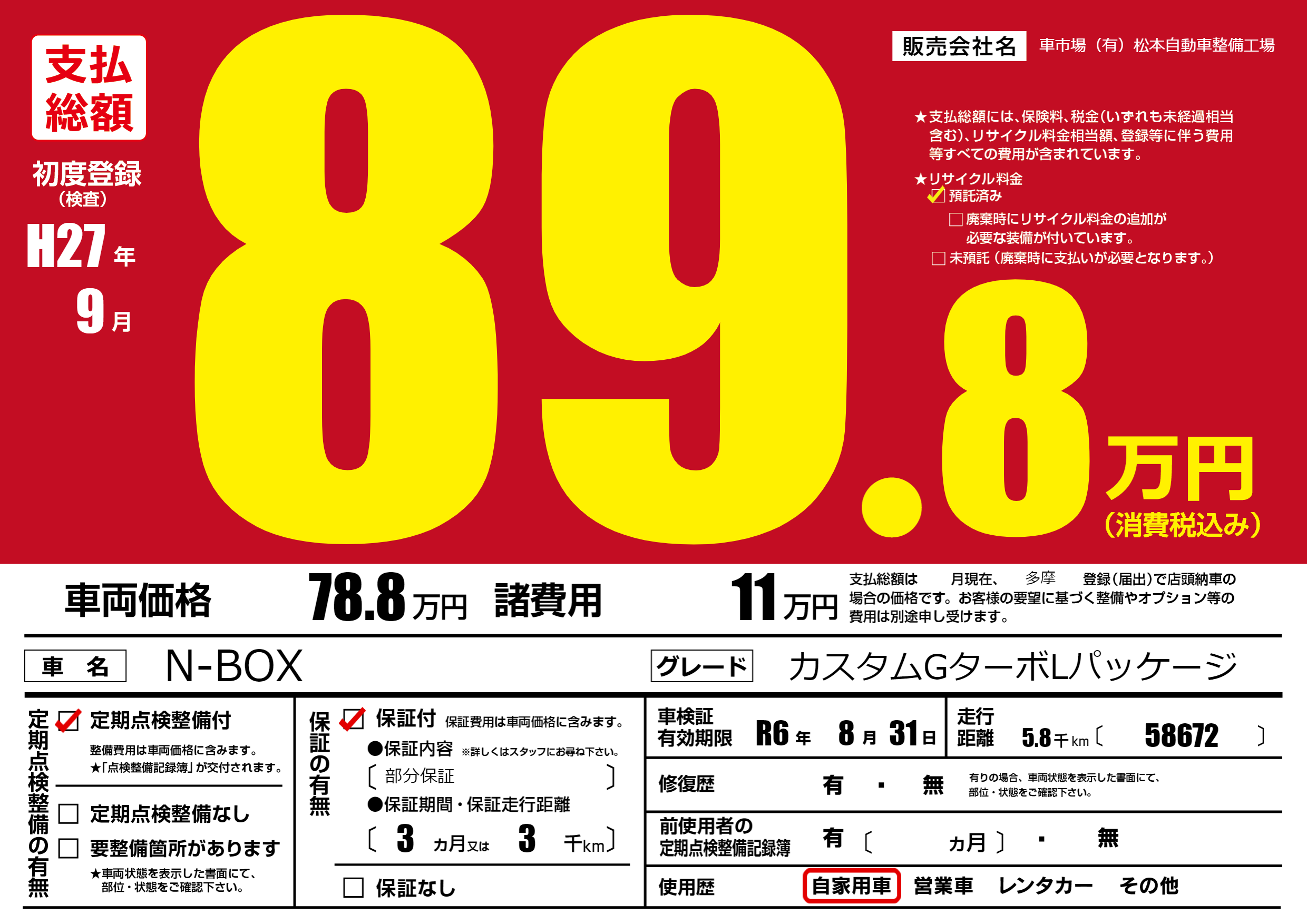 | 車名 | N-BOX | グレード ミッション 排気量 |