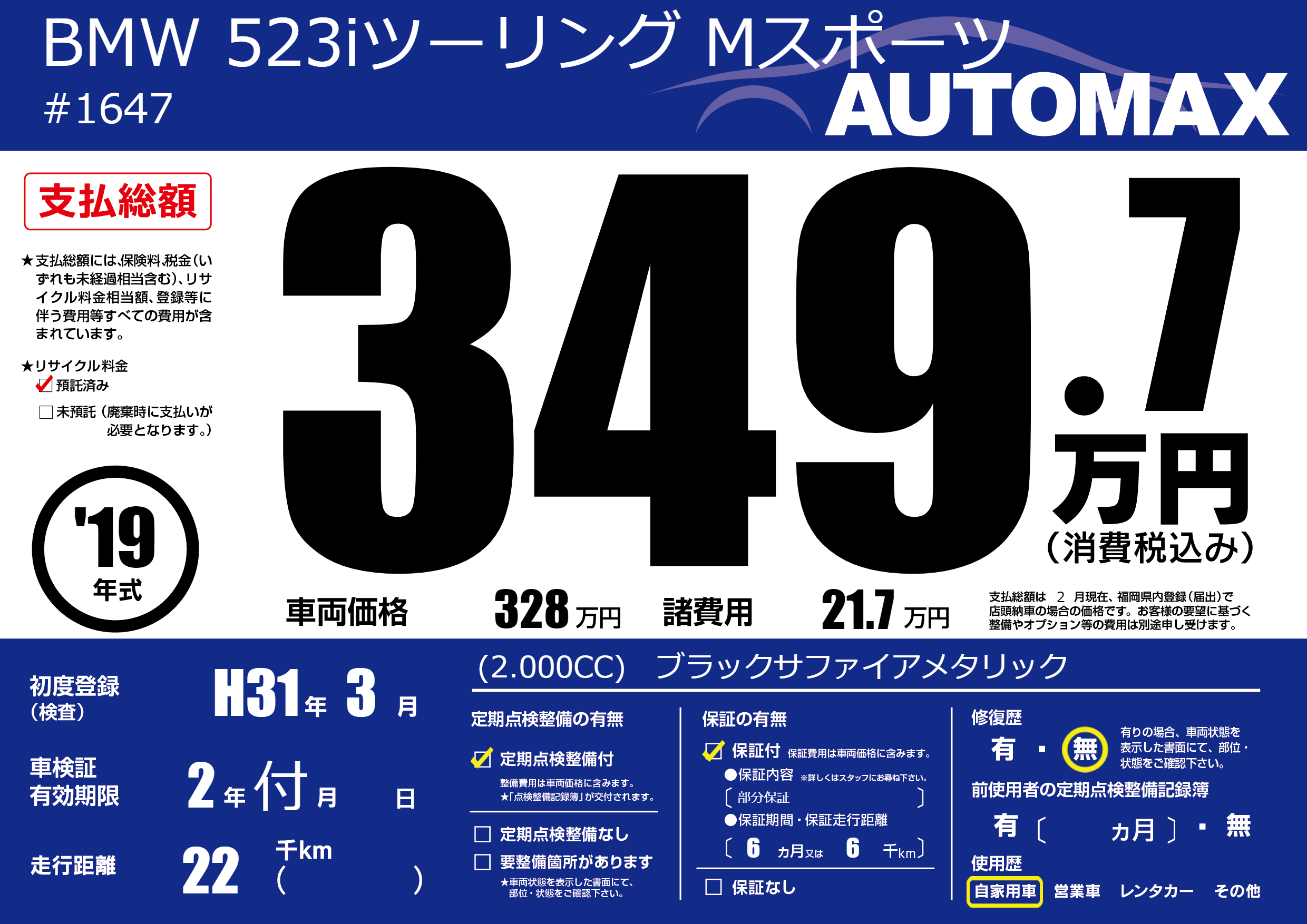 | 車名 | BMW 523iツーリング Mスポーツ | グレード ミッション 排気量 |