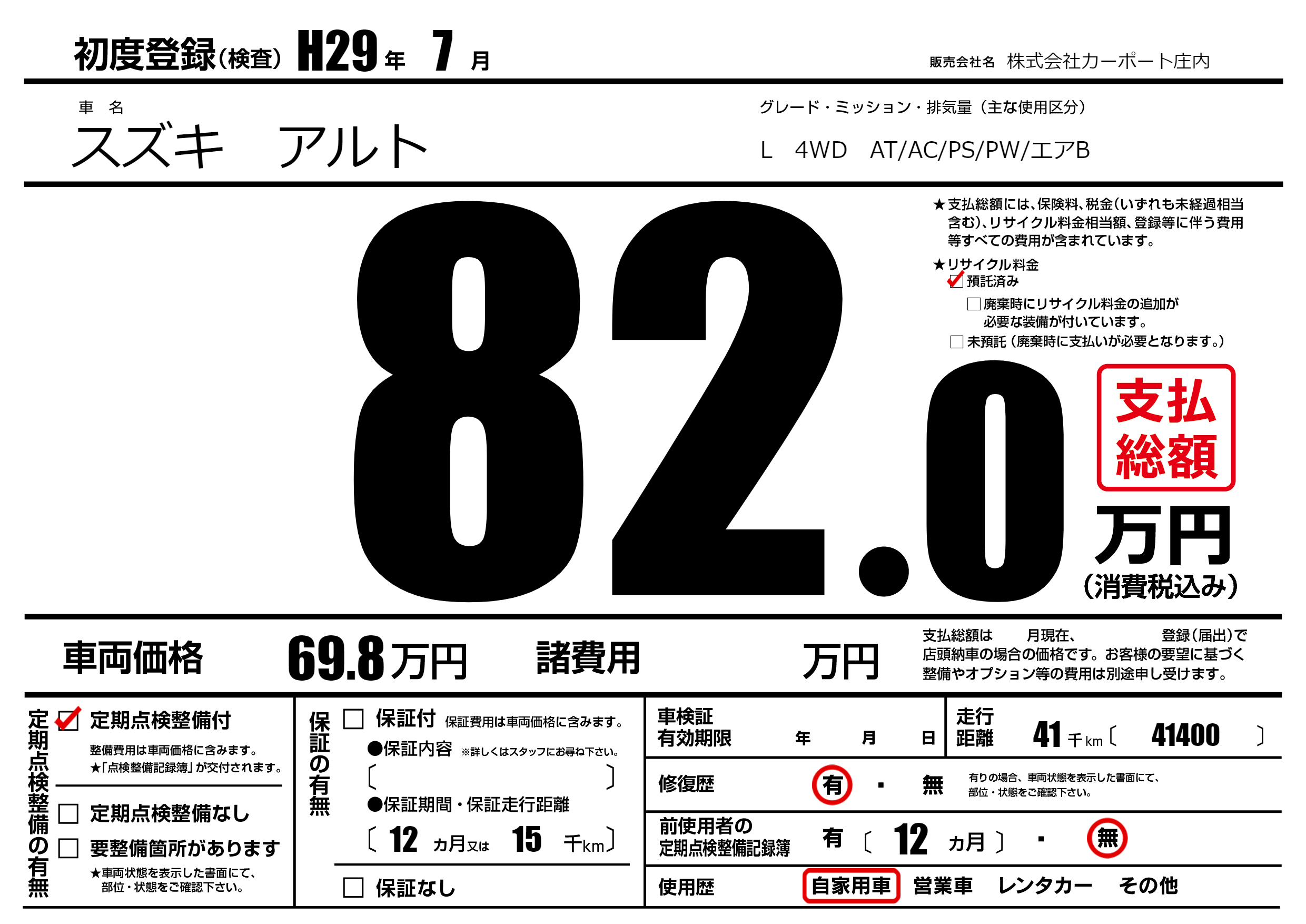 | 車名 | スズキ アルト | グレード ミッション 排気量 |
