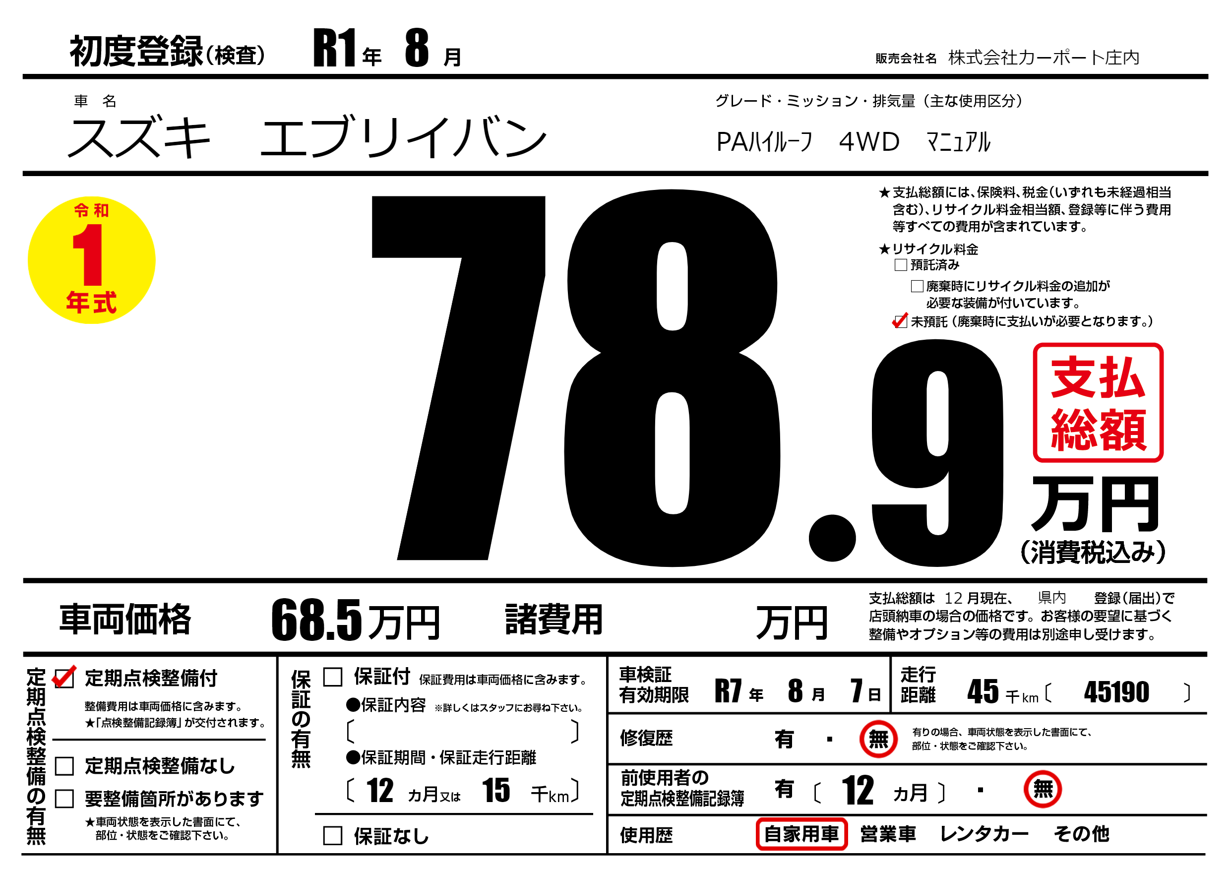 | 車名 | スズキ エブリイバン | グレード ミッション 排気量 |