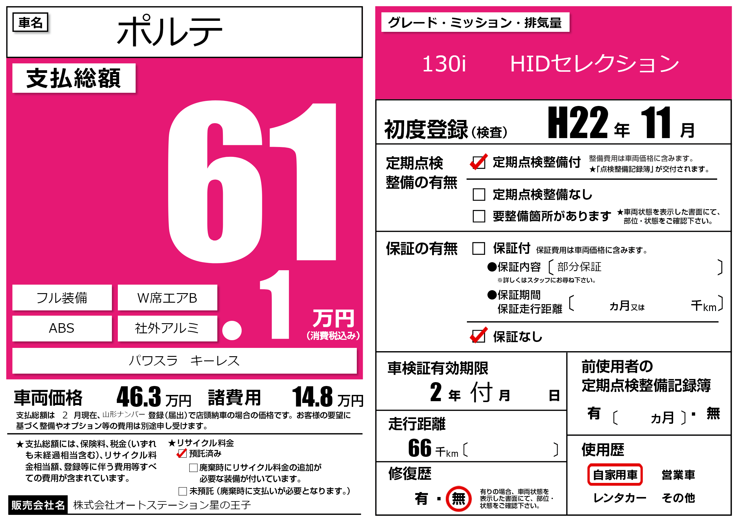 | 走行キロ | 6.6万km | 初年度登録 | H22年11月 |