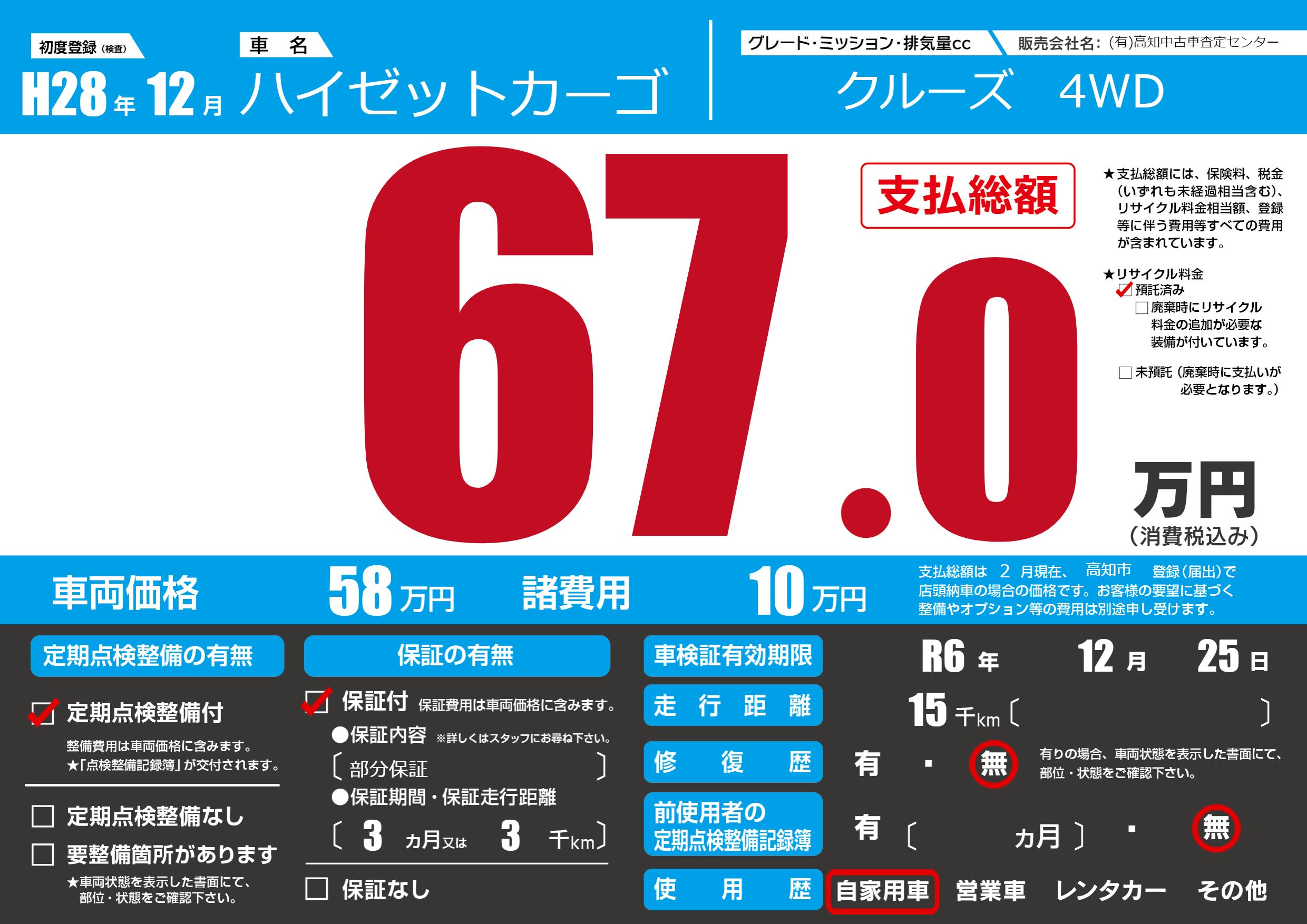 | 車名 | ハイゼットカーゴ | グレード ミッション 排気量 |