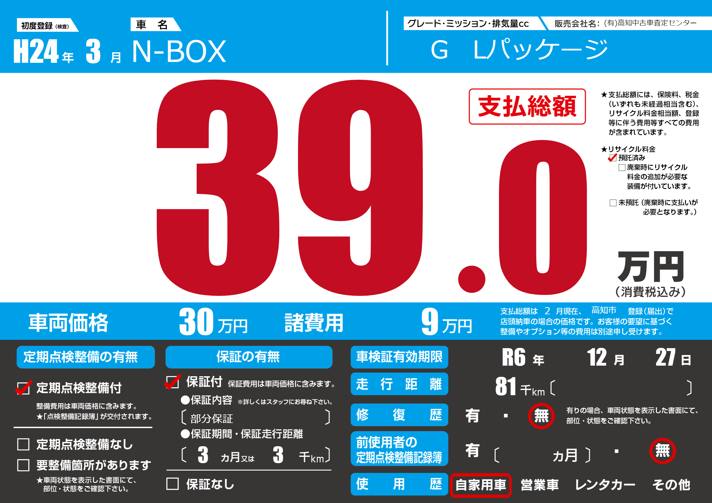 | 車検制限 | R6年 12月 27日 | ||