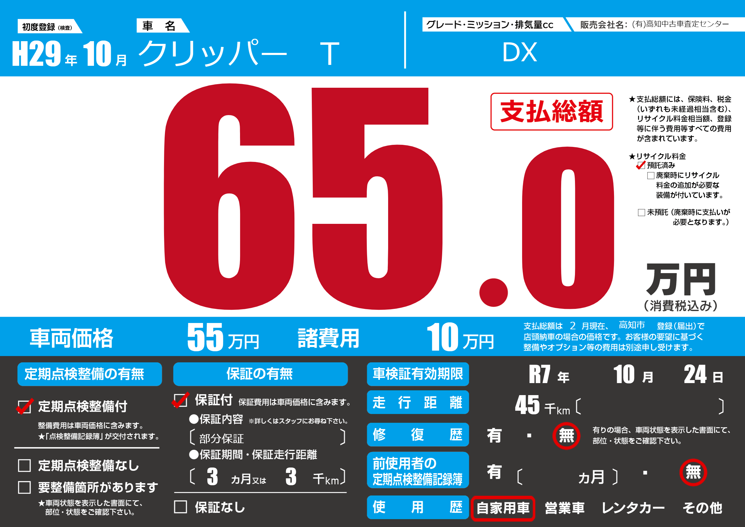 | 走行キロ | 4.5万km | 初年度登録 | H29年10月 |