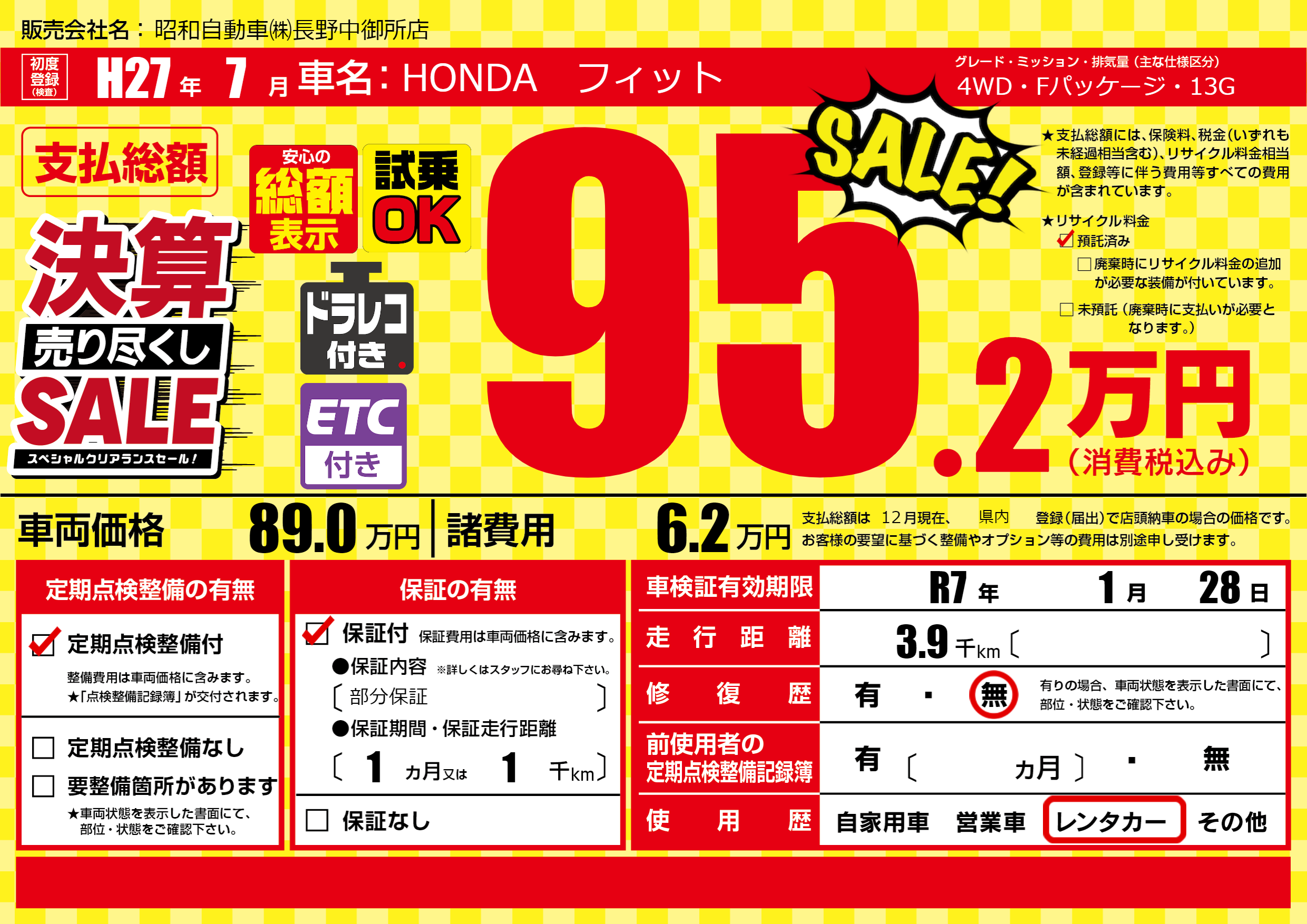 | 車名 | HONDA フィット | グレード ミッション 排気量 |
