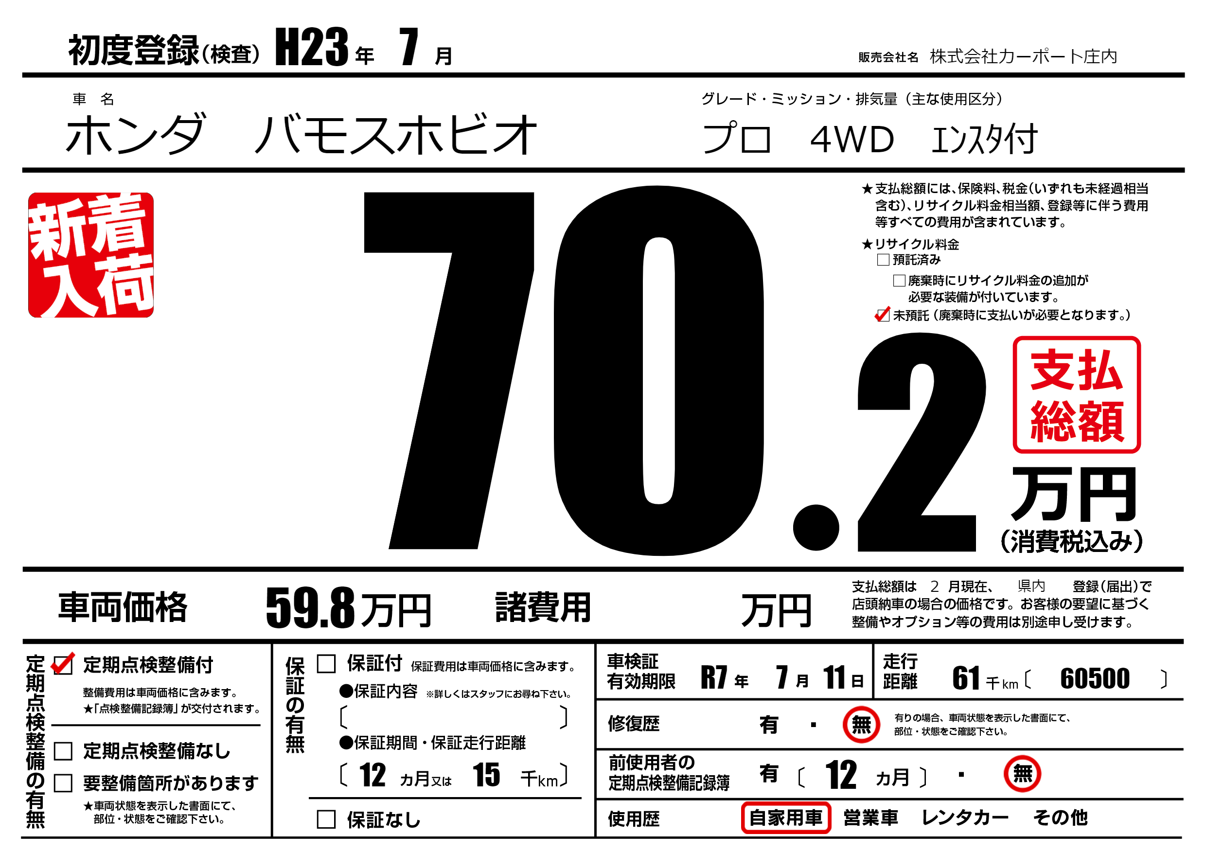 | 車名 | ホンダ バモスホビオ | グレード ミッション 排気量 |