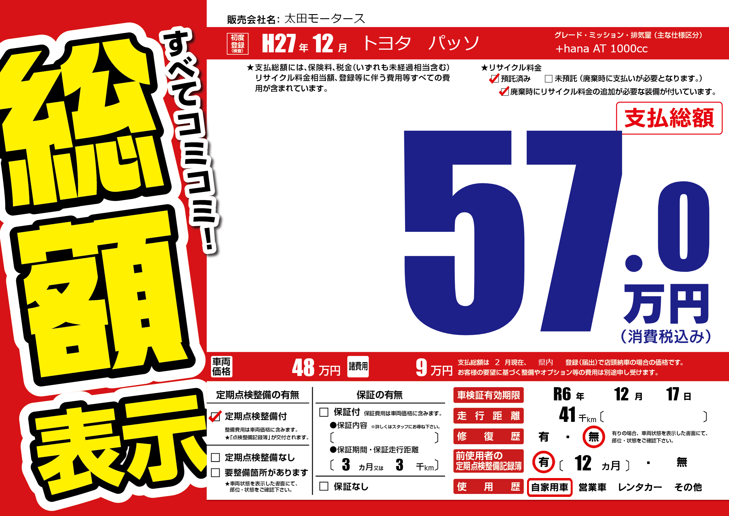 | 車名 | トヨタ パッソ | グレード ミッション 排気量 |