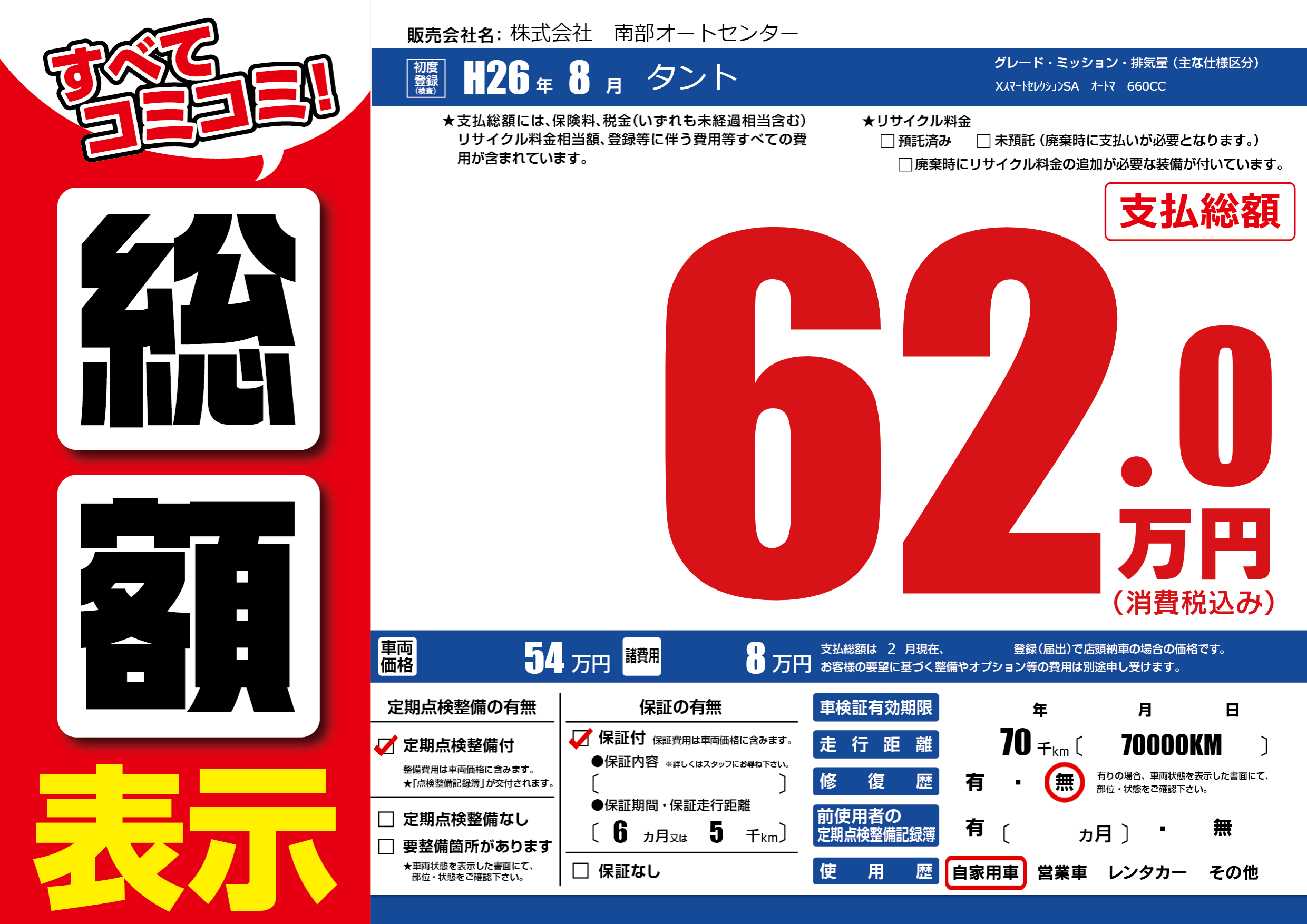 | 走行キロ | 7万km | 初年度登録 | H26年8月 |