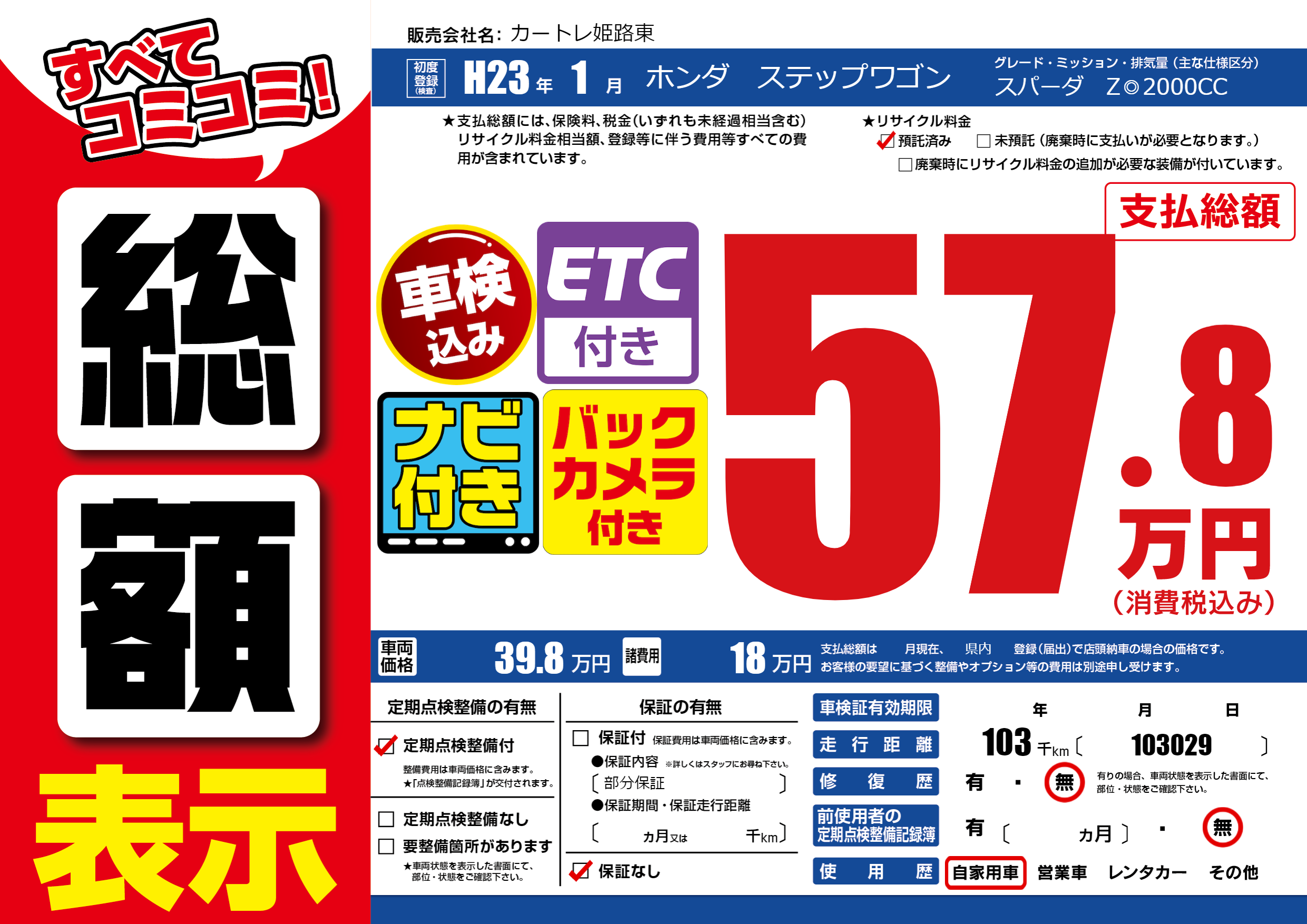 | 走行キロ | 10.3万km | 初年度登録 | H23年1月 |