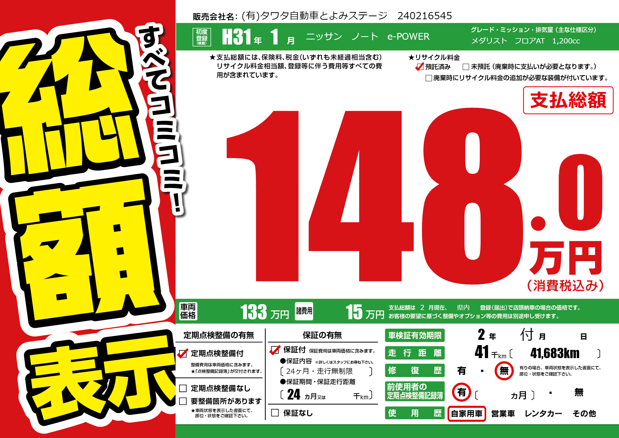 | 車名 | ニッサン ノート e-POWER | グレード ミッション 排気量 |
