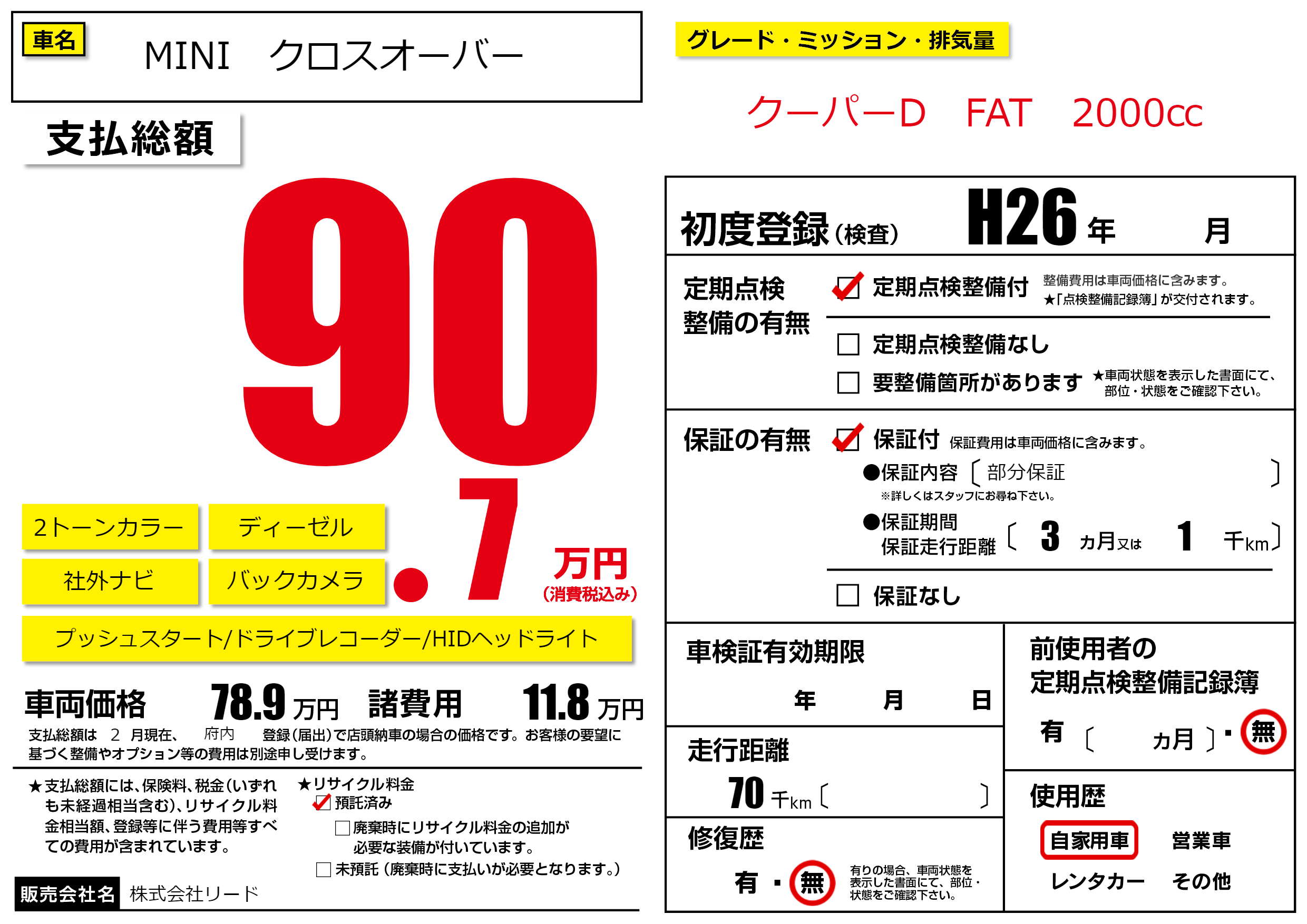 | 車名 | MINI クロスオーバー | グレード ミッション 排気量 |