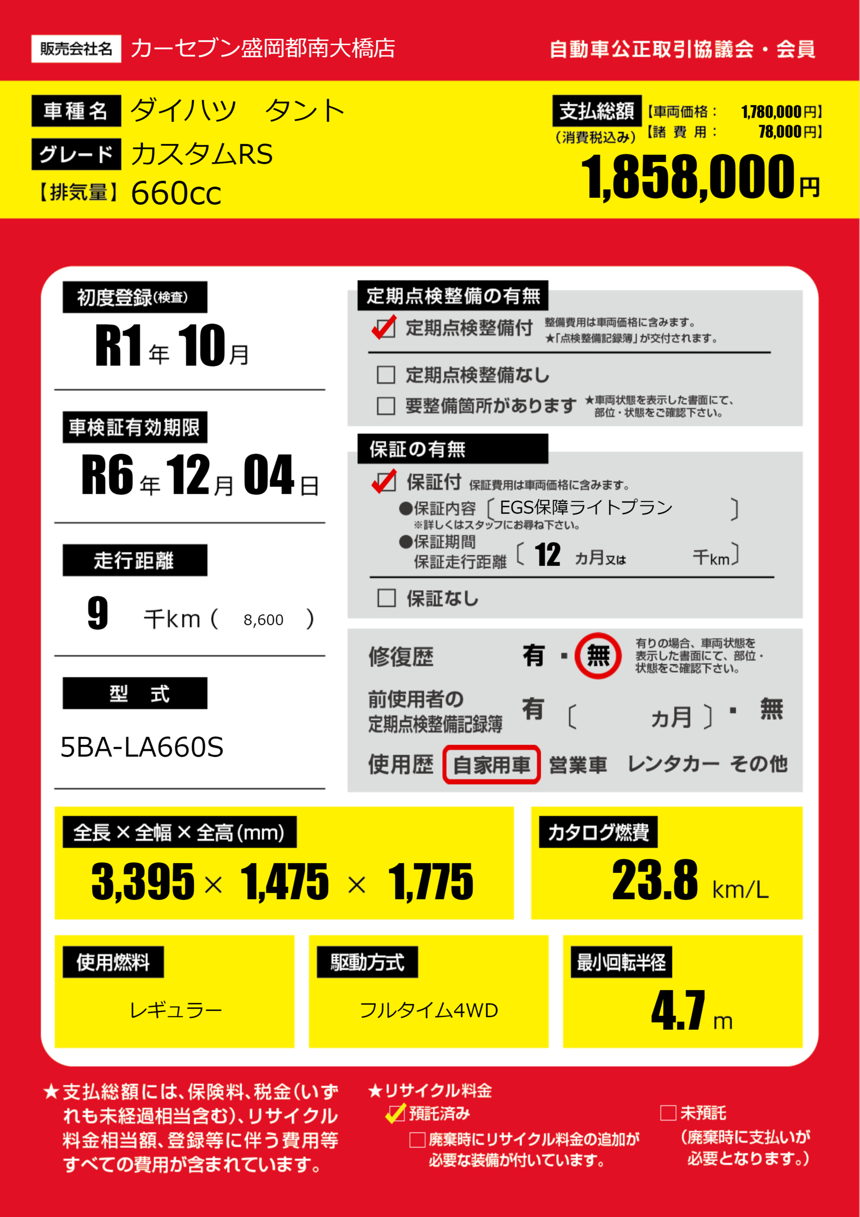 | 車名 | ダイハツ タント | グレード ミッション 排気量 |