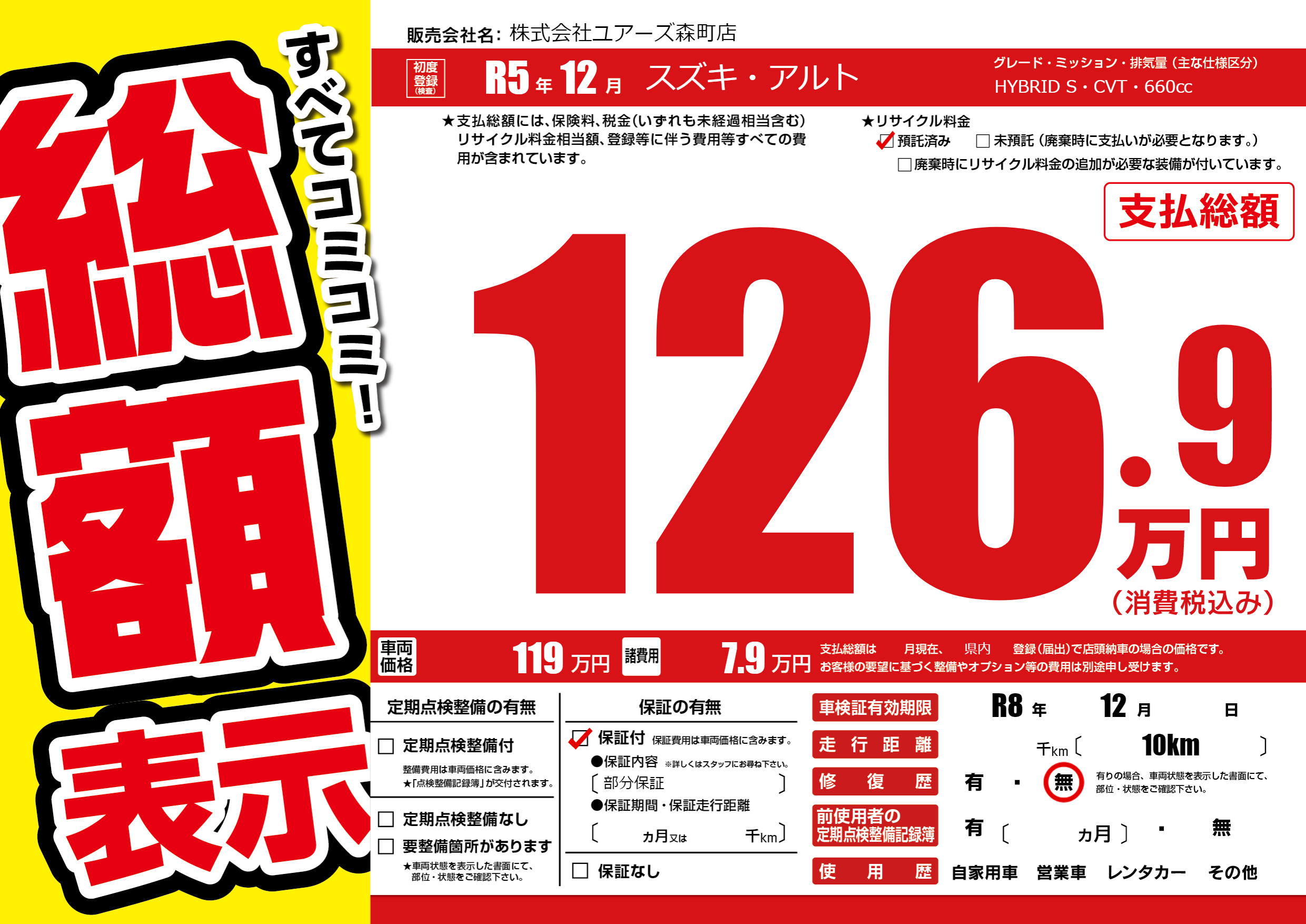 | 車名 | スズキ・アルト | グレード ミッション 排気量 |