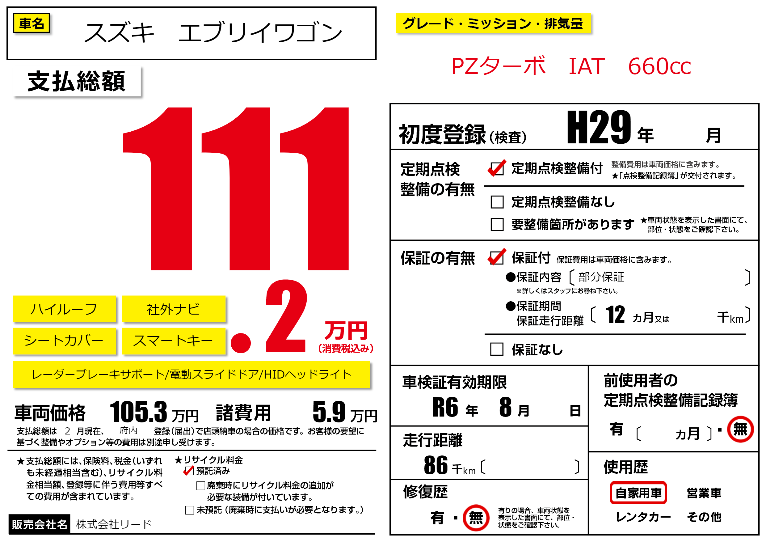 | 車名 | スズキ エブリイワゴン | グレード ミッション 排気量 |