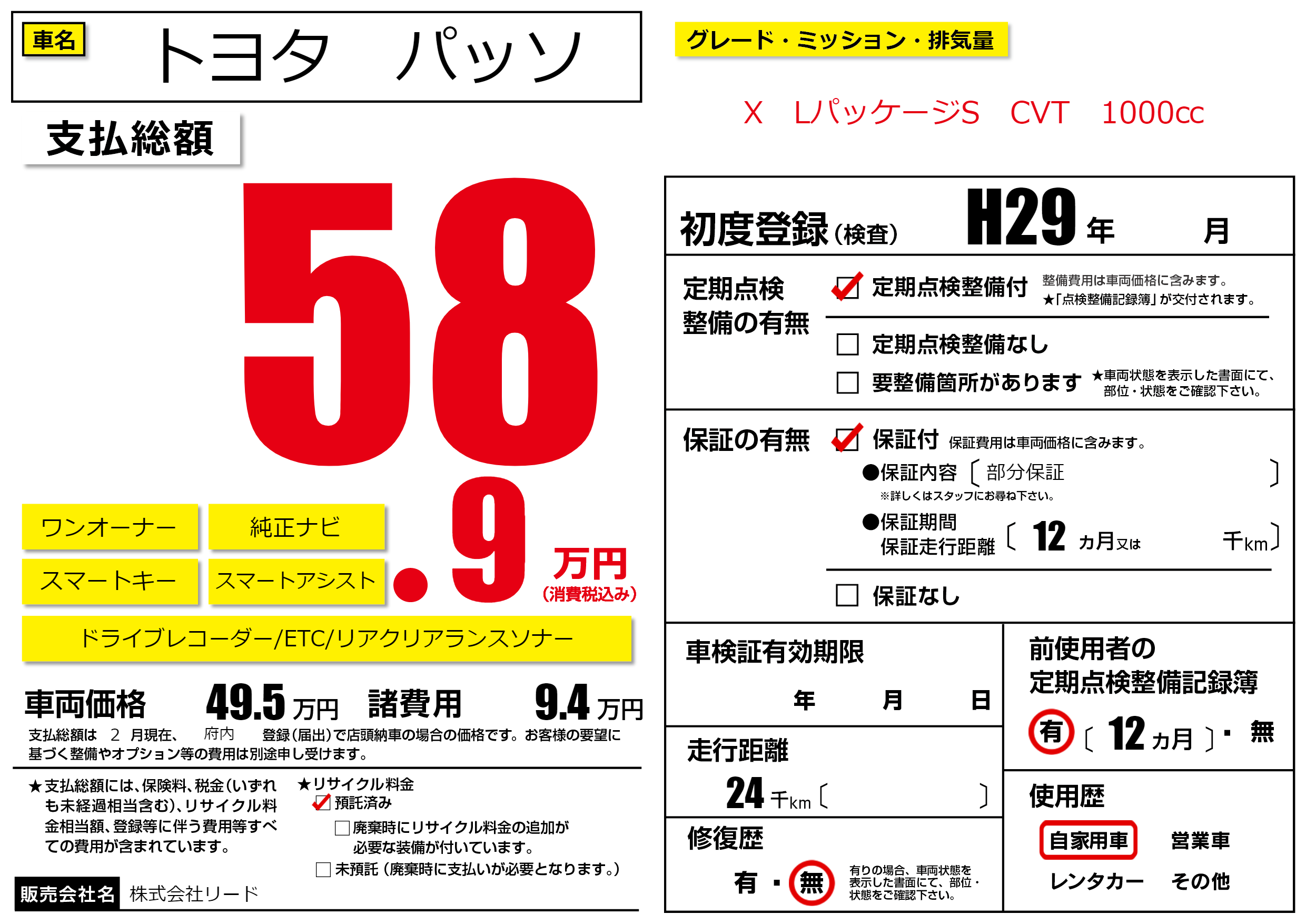 | 車名 | トヨタ パッソ | グレード ミッション 排気量 |