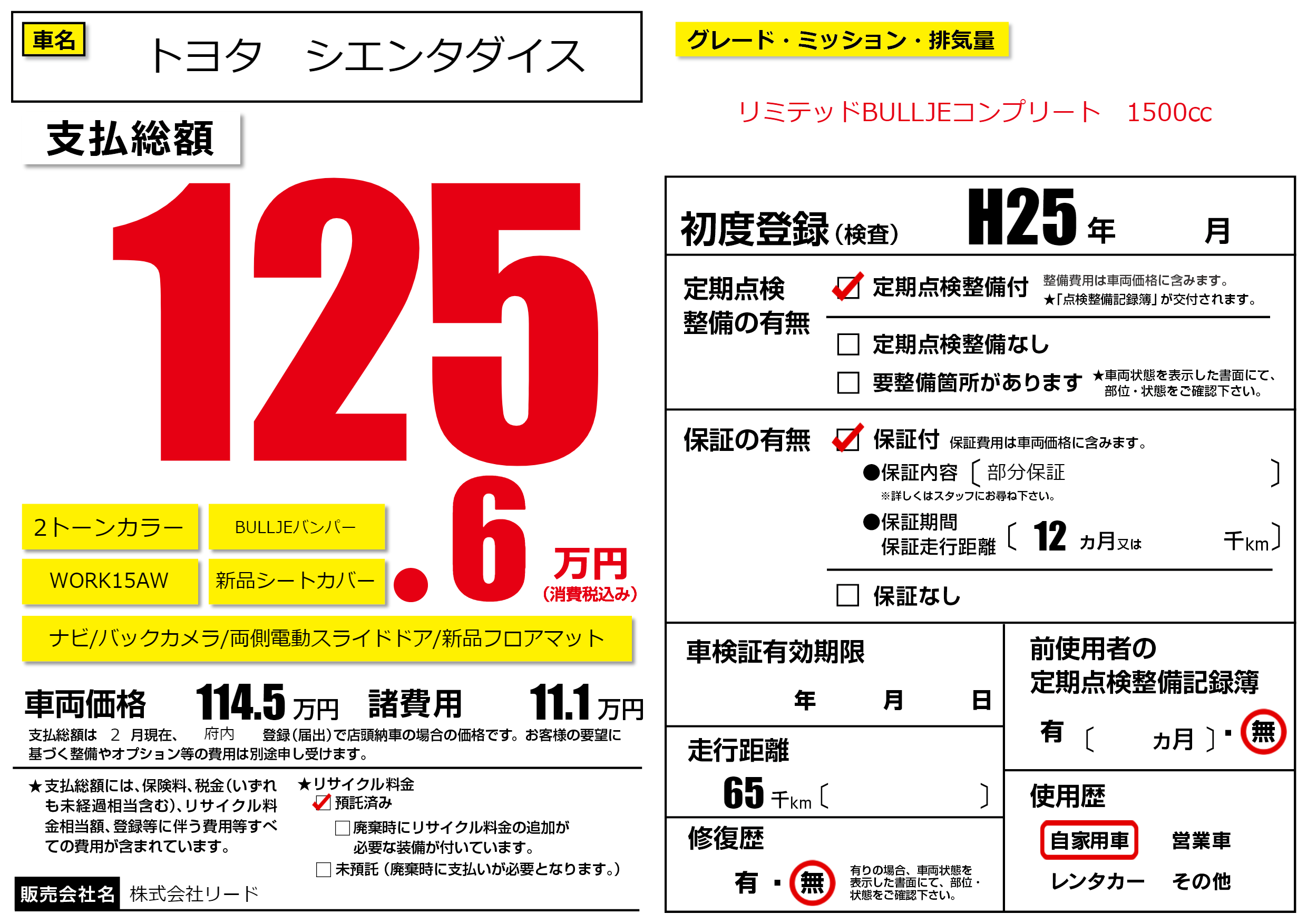 | 車名 | トヨタ シエンタダイス | グレード ミッション 排気量 |