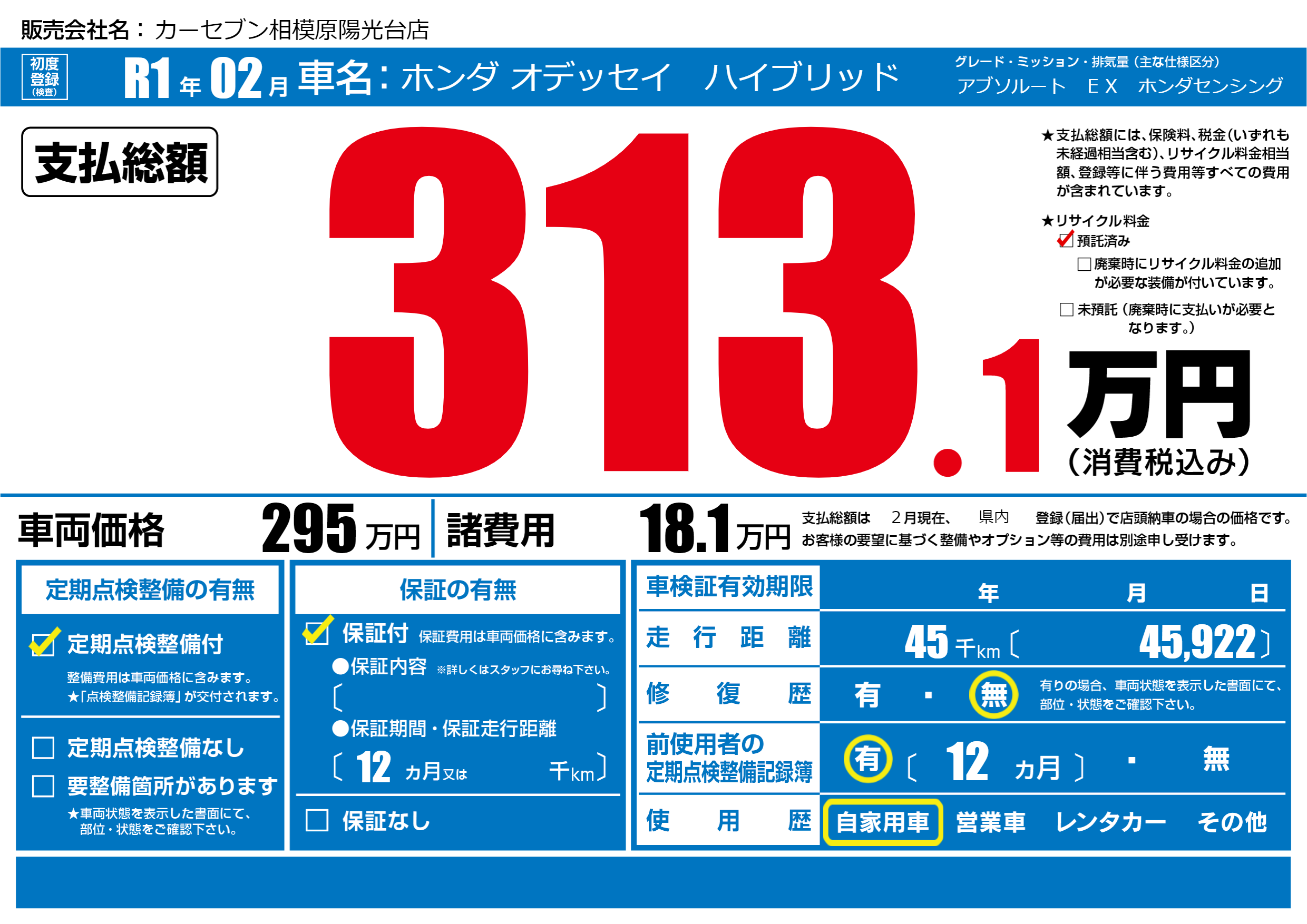 | 車名 | ホンダ オデッセイ ハイブリッド | グレード ミッション 排気量 |