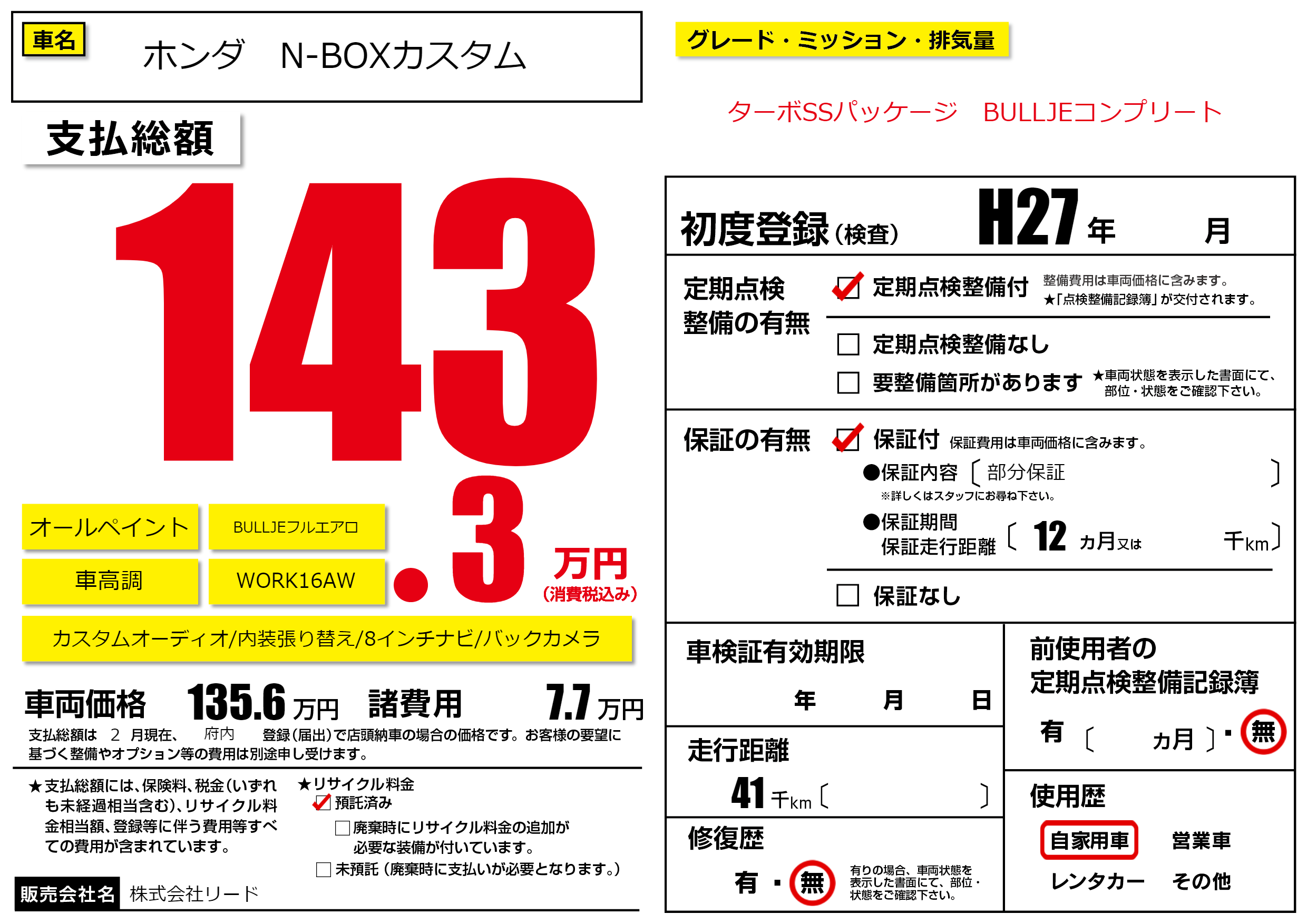| 走行キロ | 4.1万km | 初年度登録 | H27年---月 |