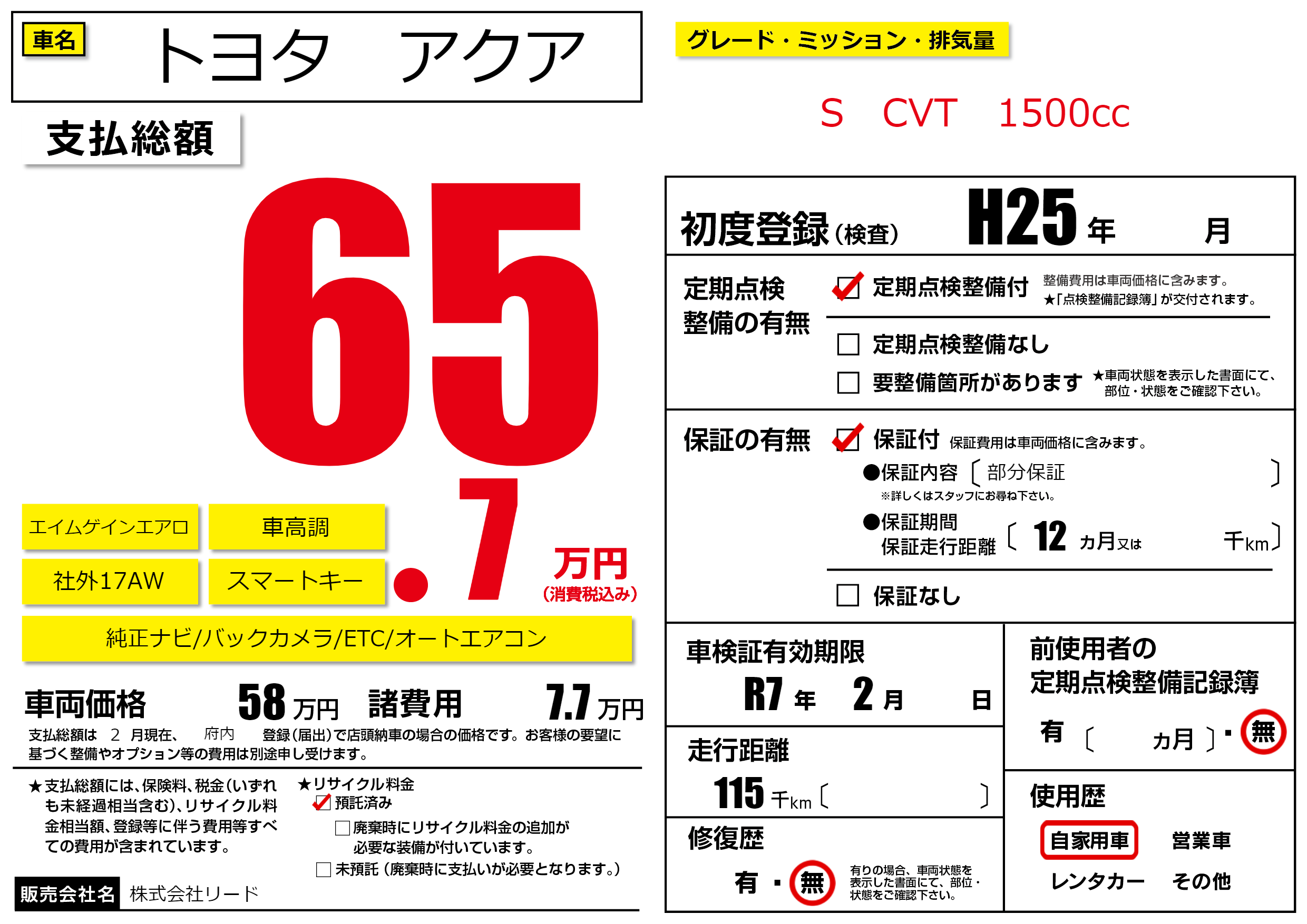| 車検制限 | R7年 2月 - 日 | ||