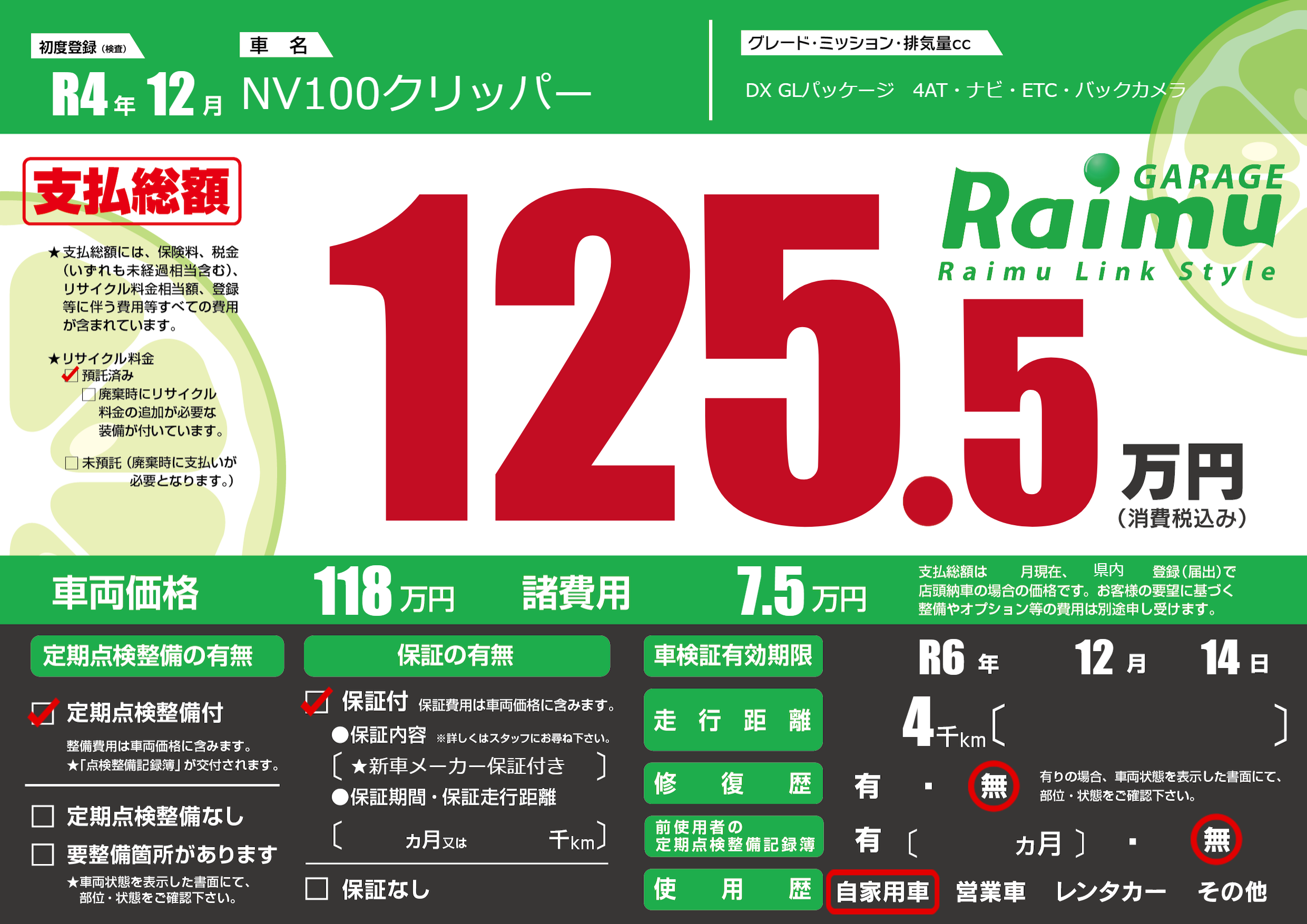 | 車検制限 | R6年 12月 14日 | ||