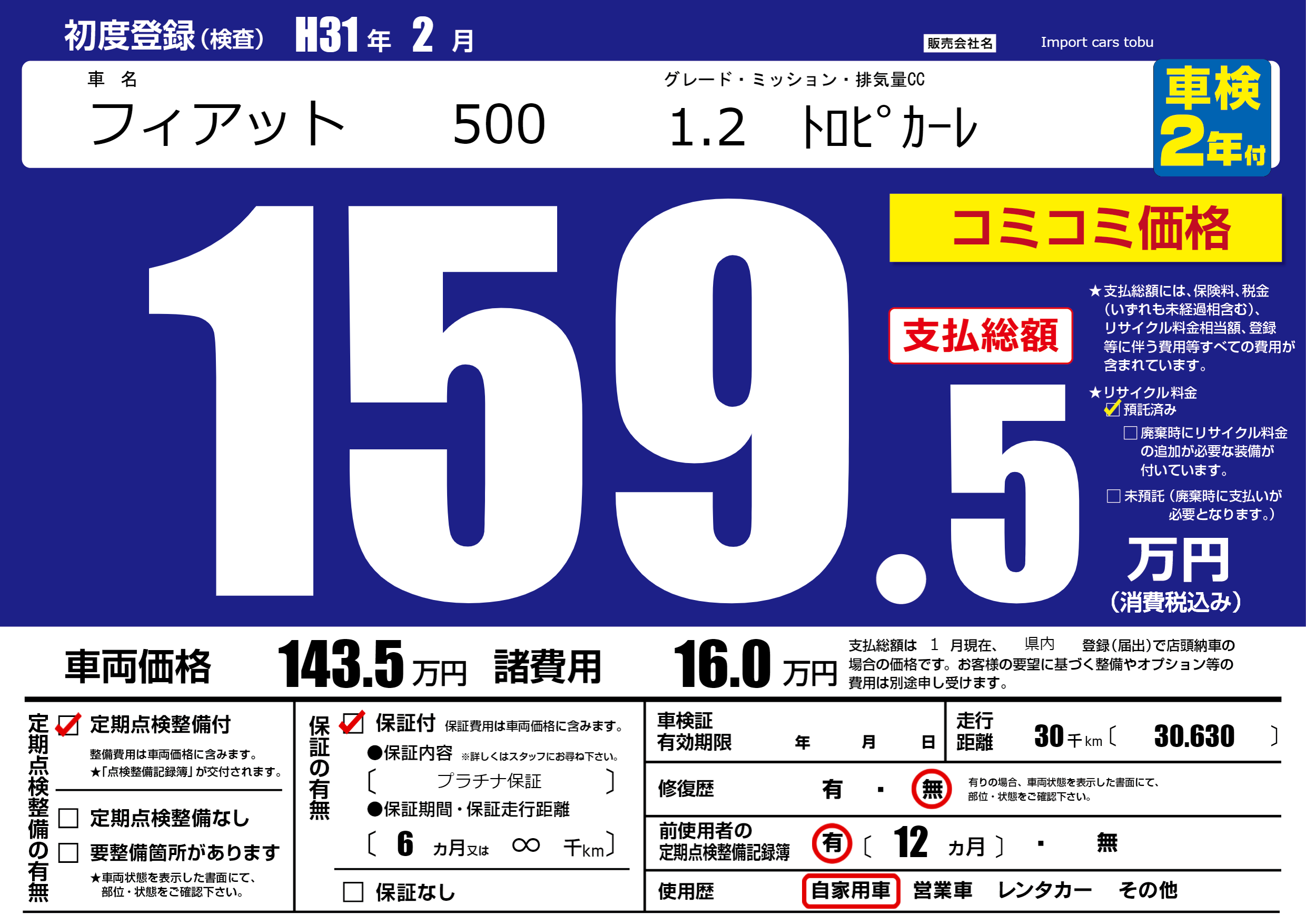 | 車名 | フィアット 500 | グレード ミッション 排気量 |