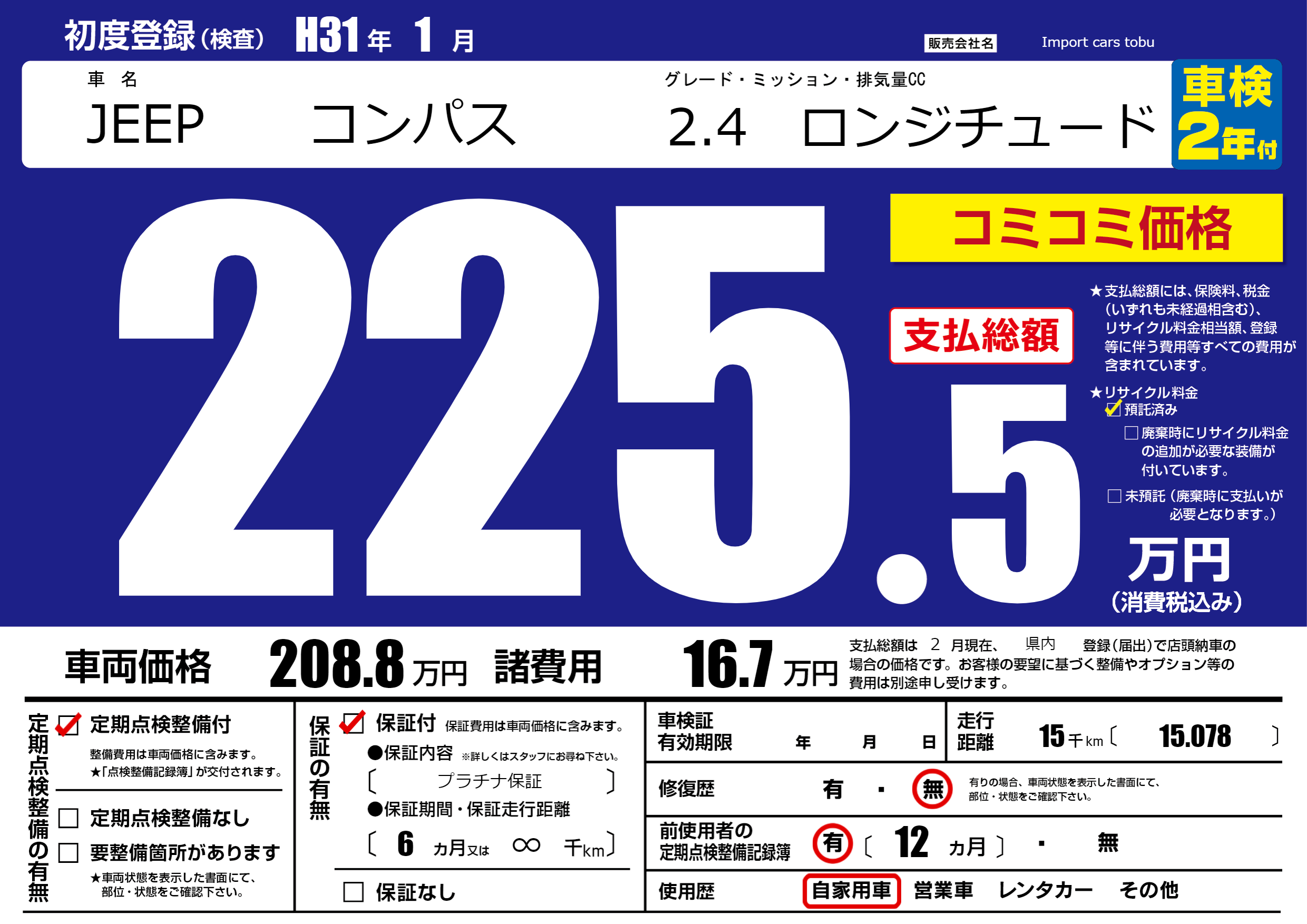 保証付き 保証内容( プラチナ保証) 6ヶ月または(∞)千kmまで |