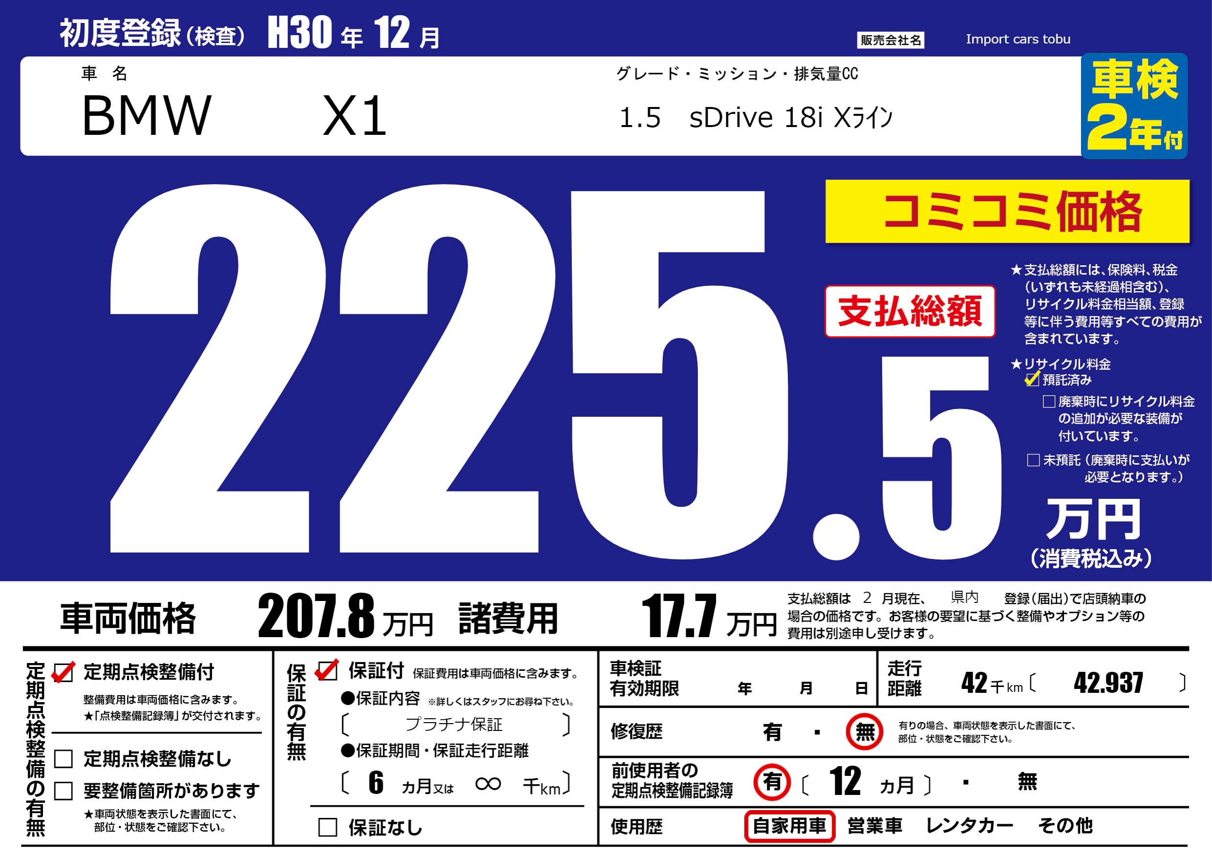 保証付き 保証内容( プラチナ保証) 6ヶ月または(∞)千kmまで |