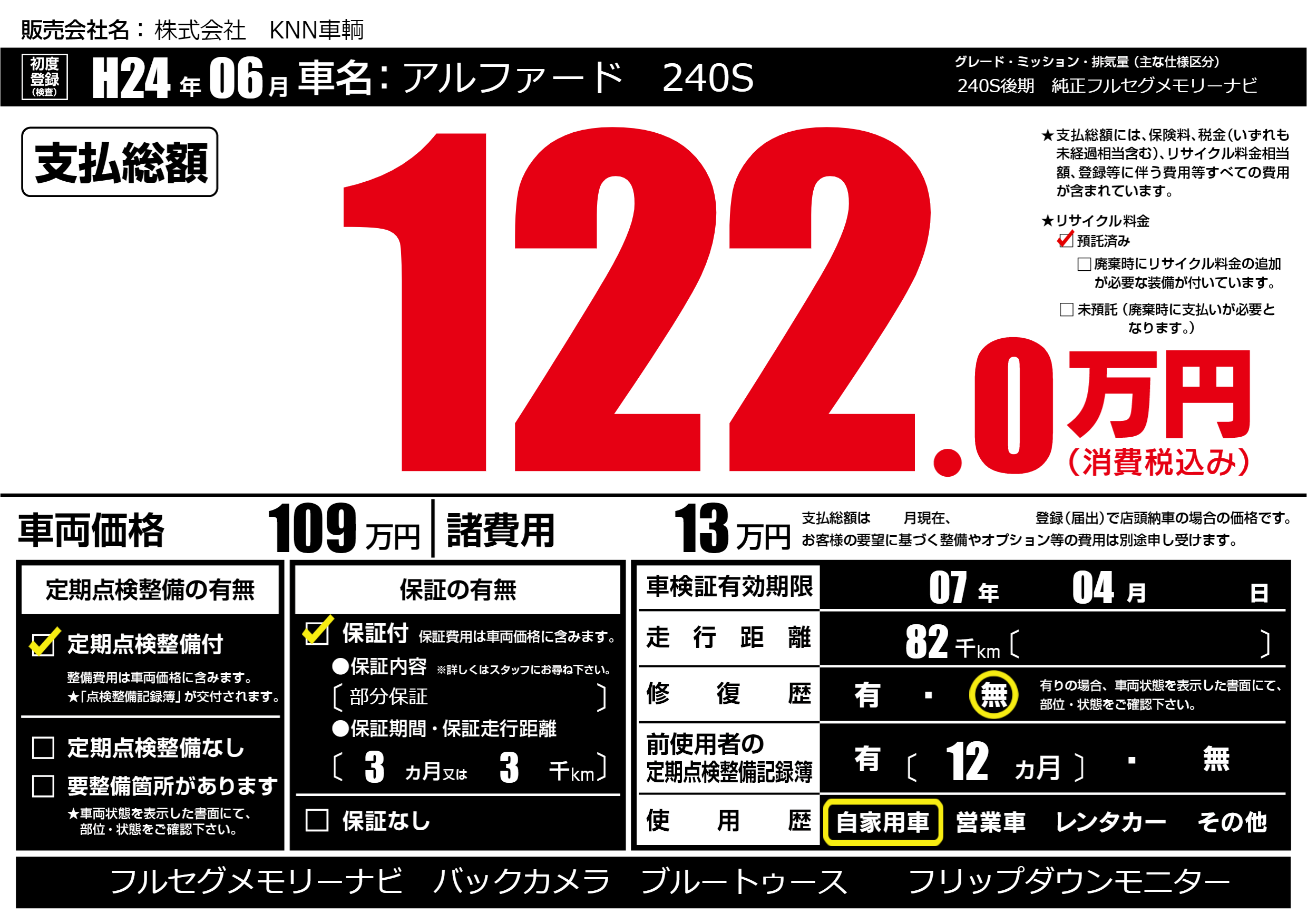 | 車名 | アルファード 240S | グレード ミッション 排気量 |