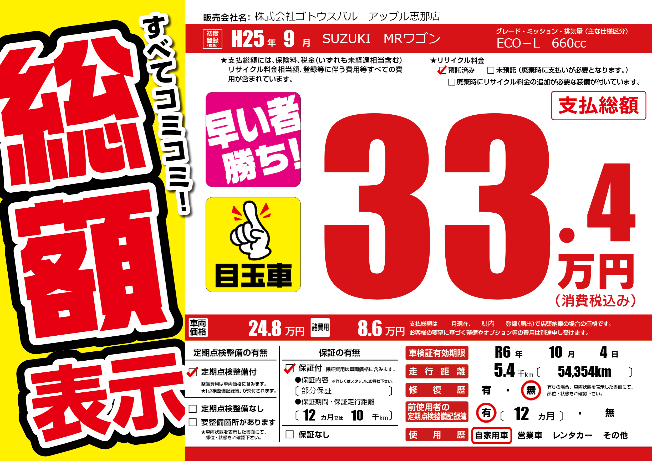 | 車名 | SUZUKI MRワゴン | グレード ミッション 排気量 |