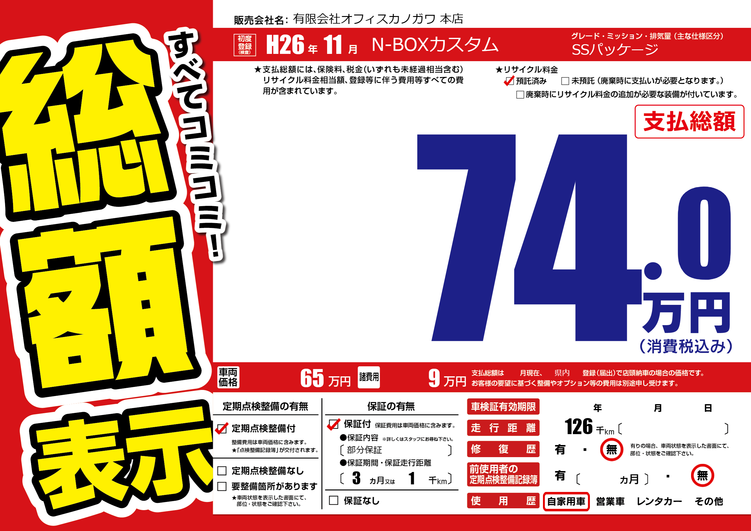 | 走行キロ | 12.6万km | 初年度登録 | H26年11月 |