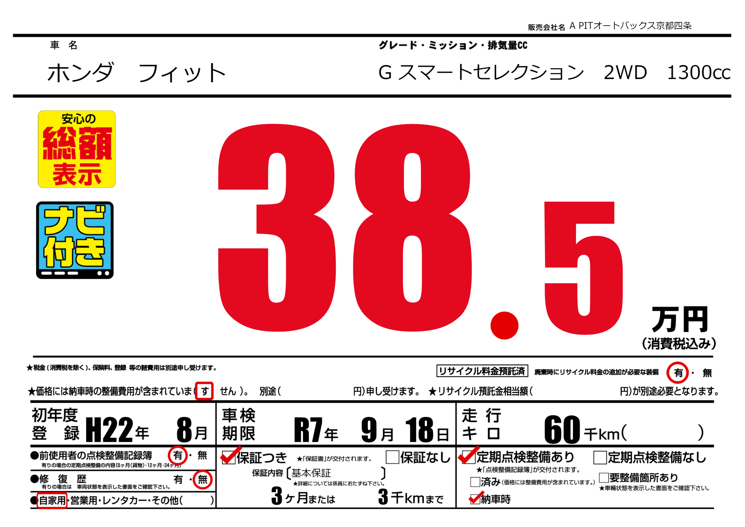 | 車検制限 | R7年 9月 18日 | ||