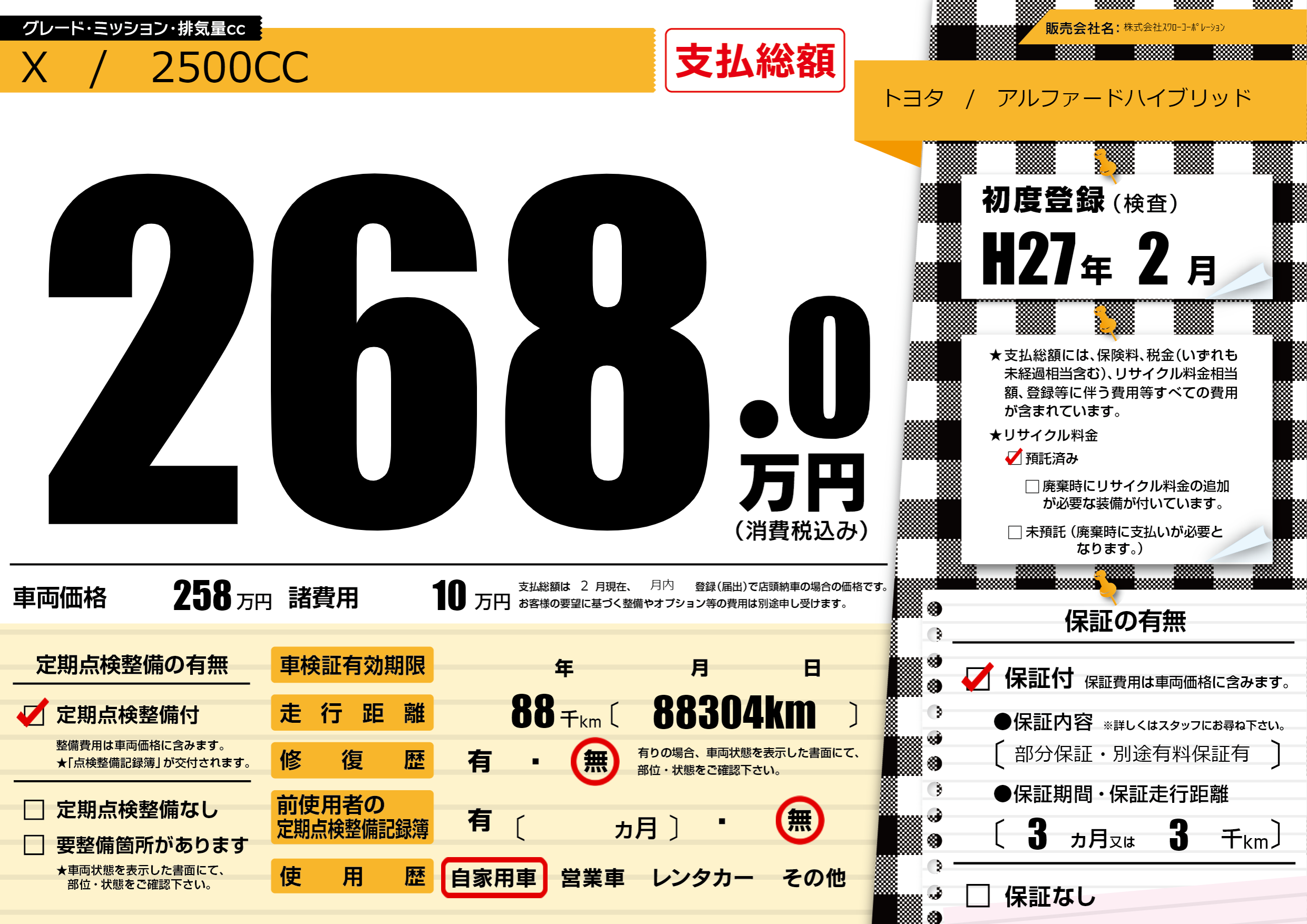 | 車名 | トヨタ / アルファードハイブリッド | グレード ミッション 排気量 |