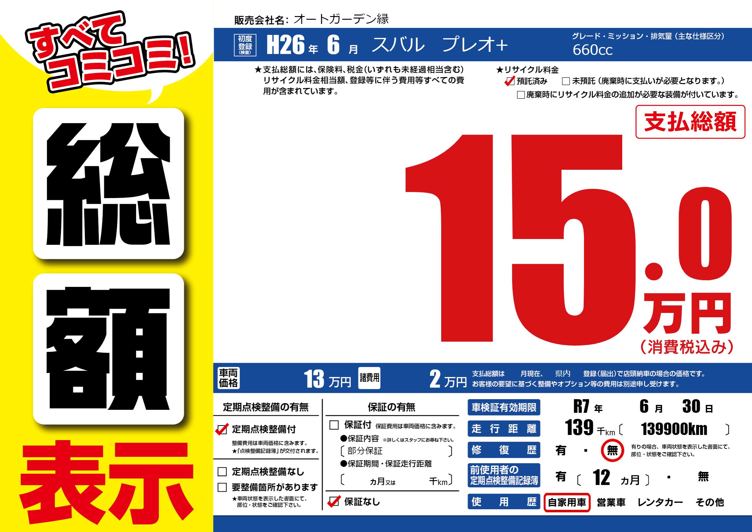 | 車名 | スバル プレオ+ | グレード ミッション 排気量 |
