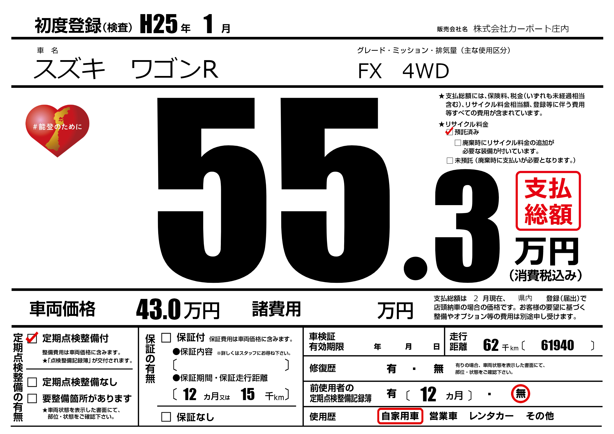 | 車名 | スズキ ワゴンR | グレード ミッション 排気量 |