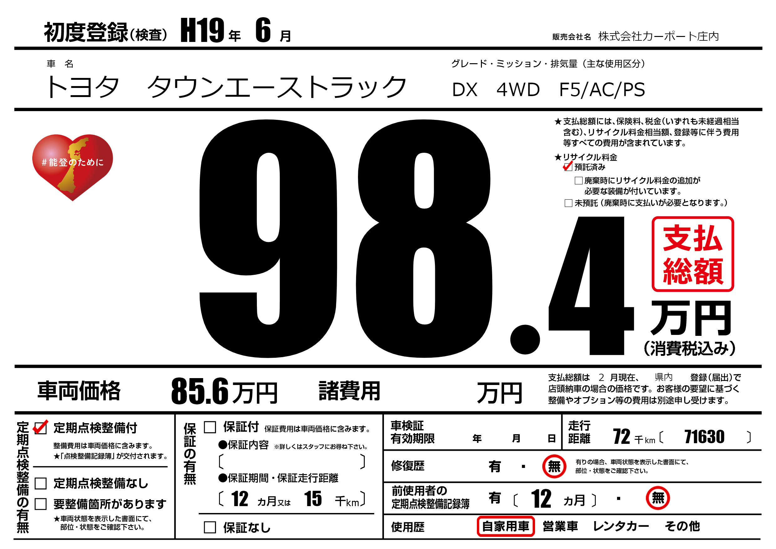 | 車名 | トヨタ タウンエーストラック | グレード ミッション 排気量 |