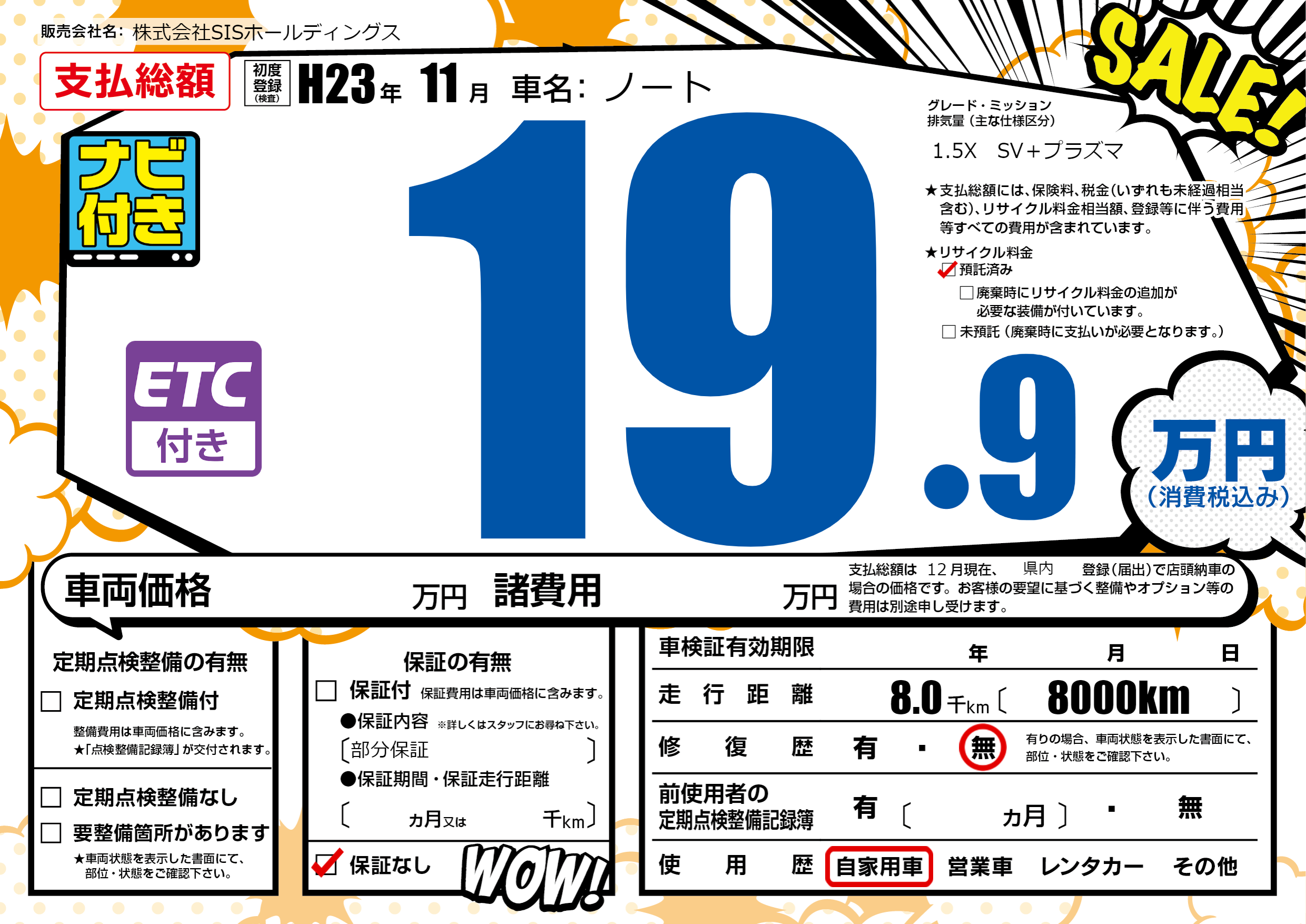 | 走行キロ | 0.8万km | 初年度登録 | H23年11月 |