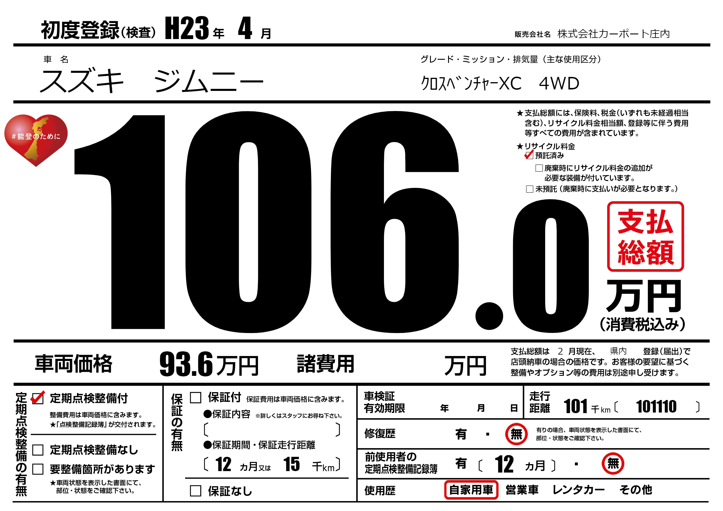 | 走行キロ | 10.1万km | 初年度登録 | H23年4月 |