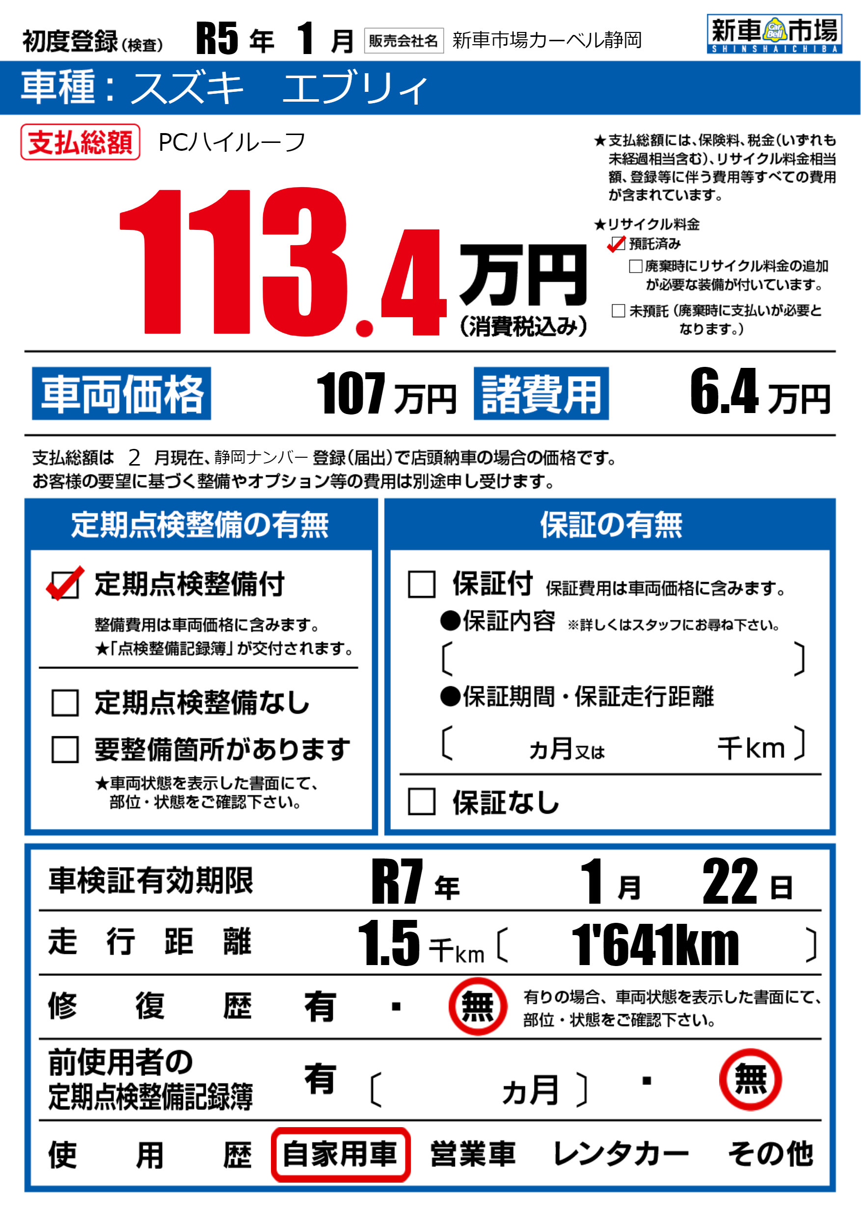 | 走行キロ | 0.1万km | 初年度登録 | R5年1月 |