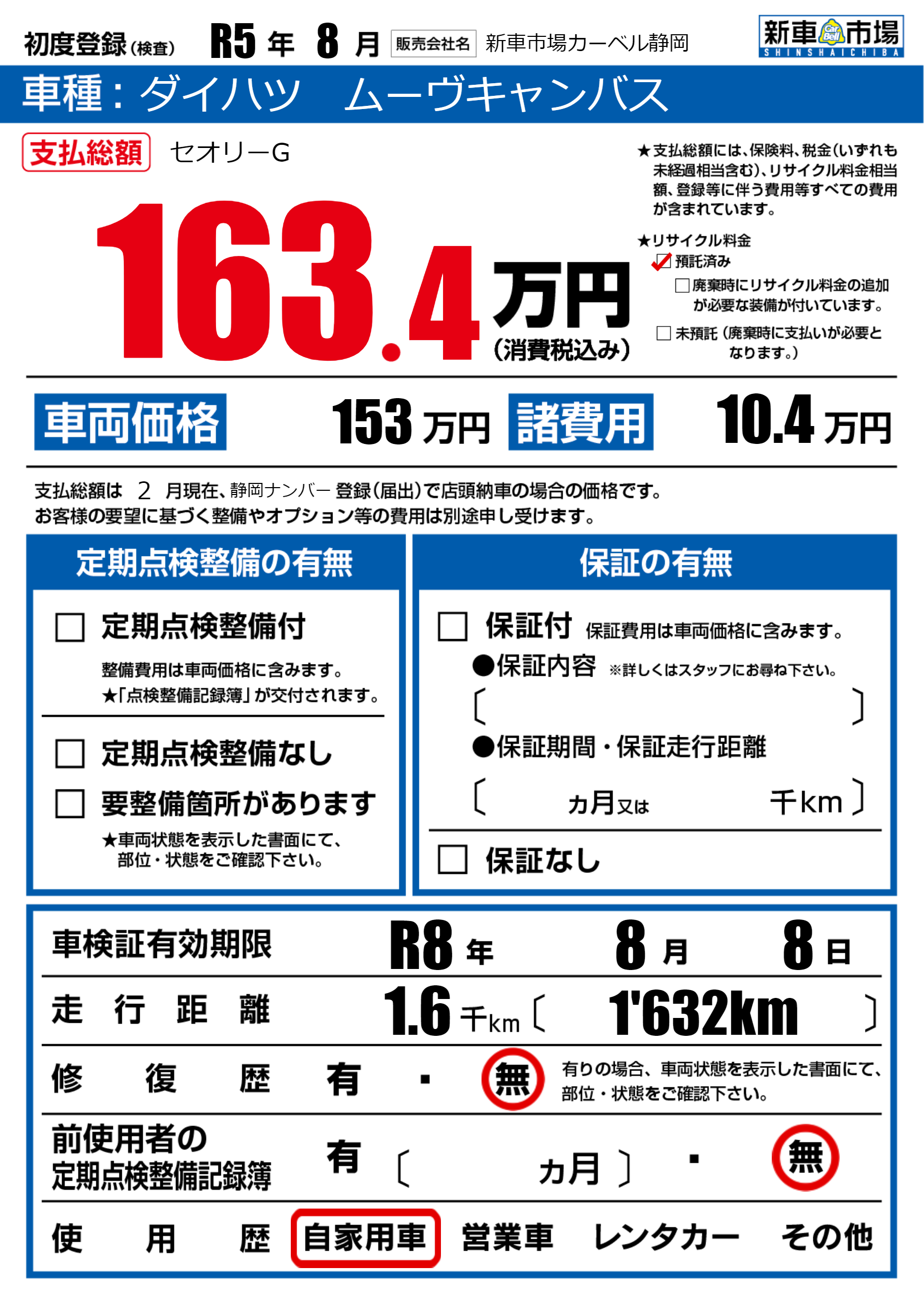 | 走行キロ | 0.1万km | 初年度登録 | R5年8月 |