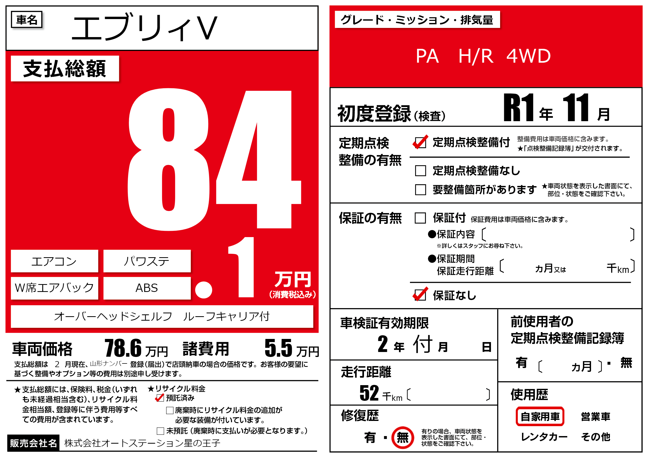 | 車名 | エブリィV | グレード ミッション 排気量 |