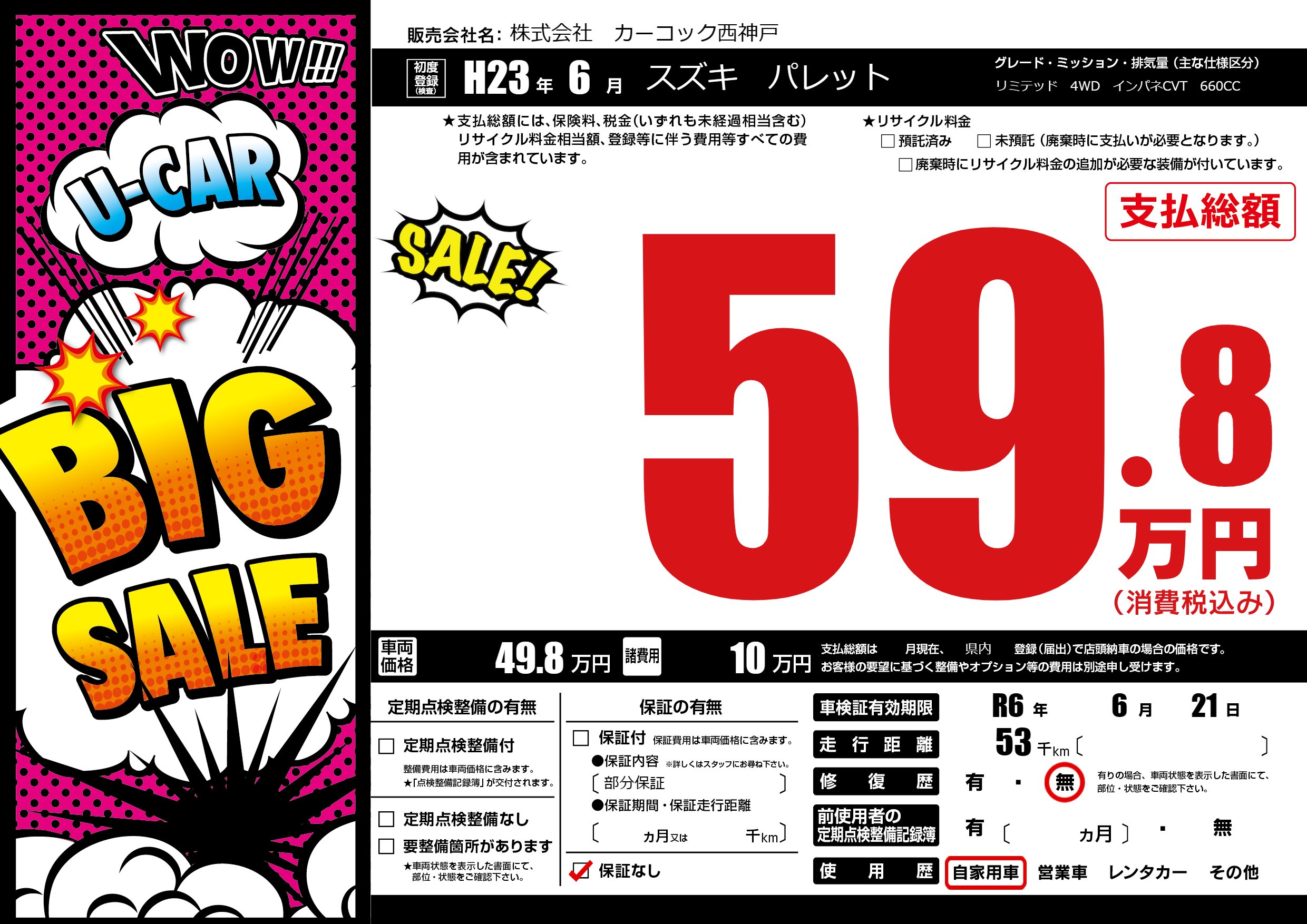 | 走行キロ | 5.3万km | 初年度登録 | H23年6月 |