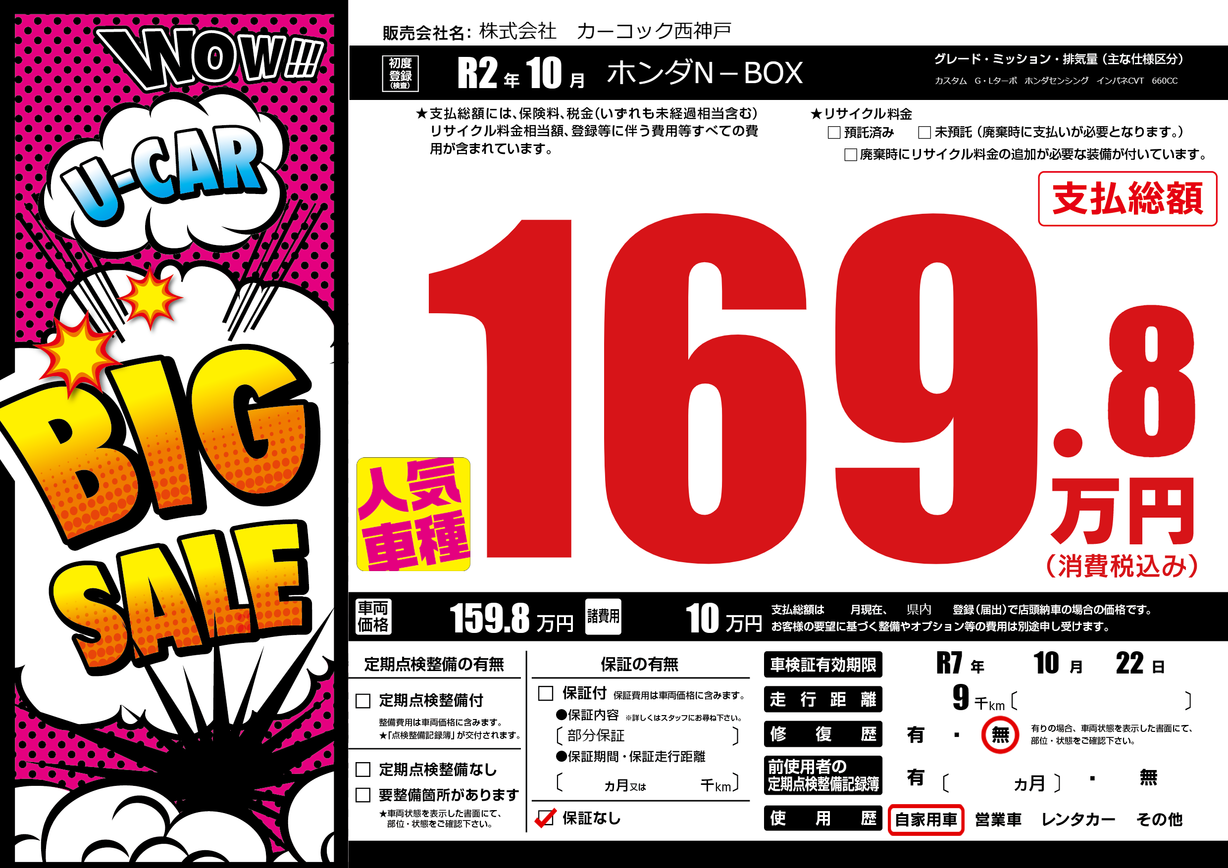 | 車名 | ホンダN-BOX | グレード ミッション 排気量 |