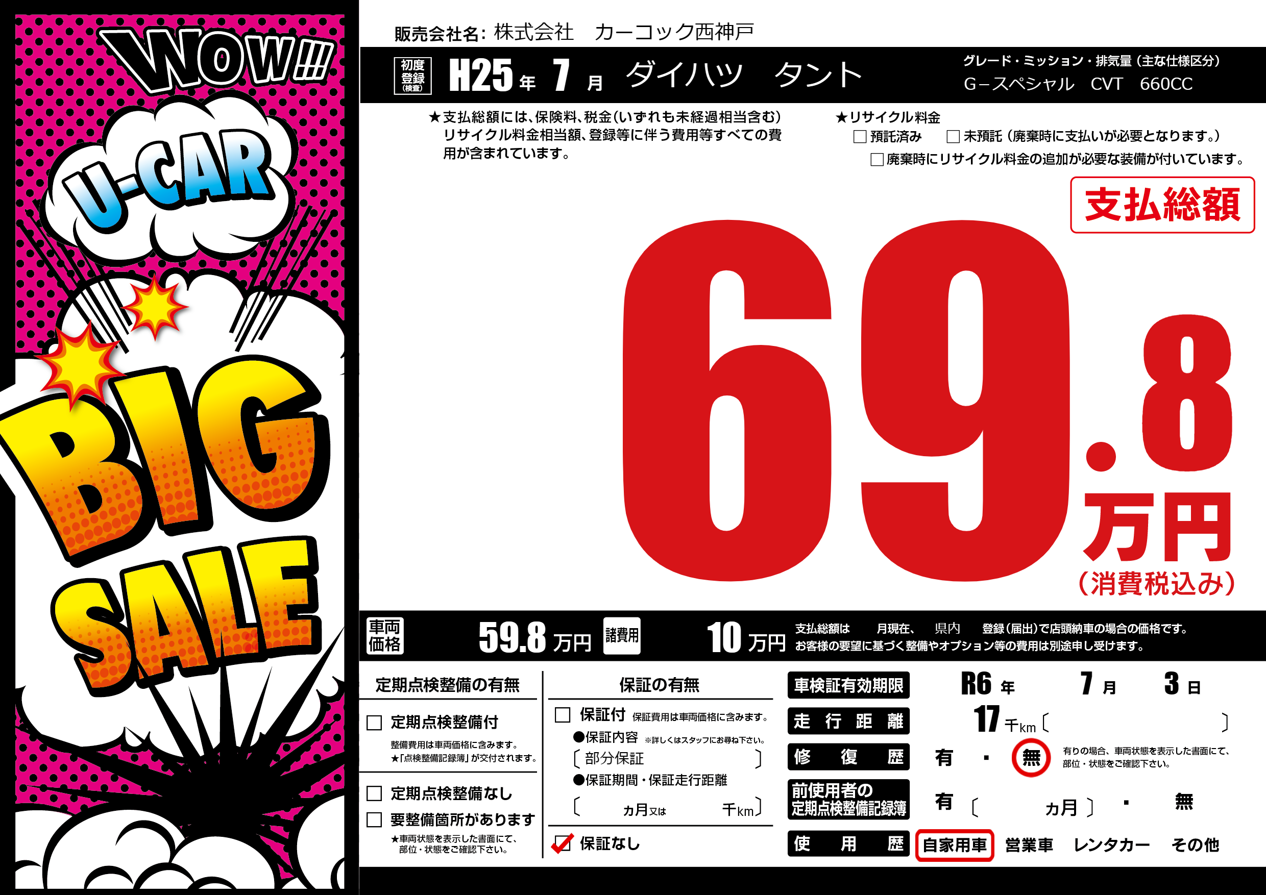 | 走行キロ | 1.7万km | 初年度登録 | H25年7月 |