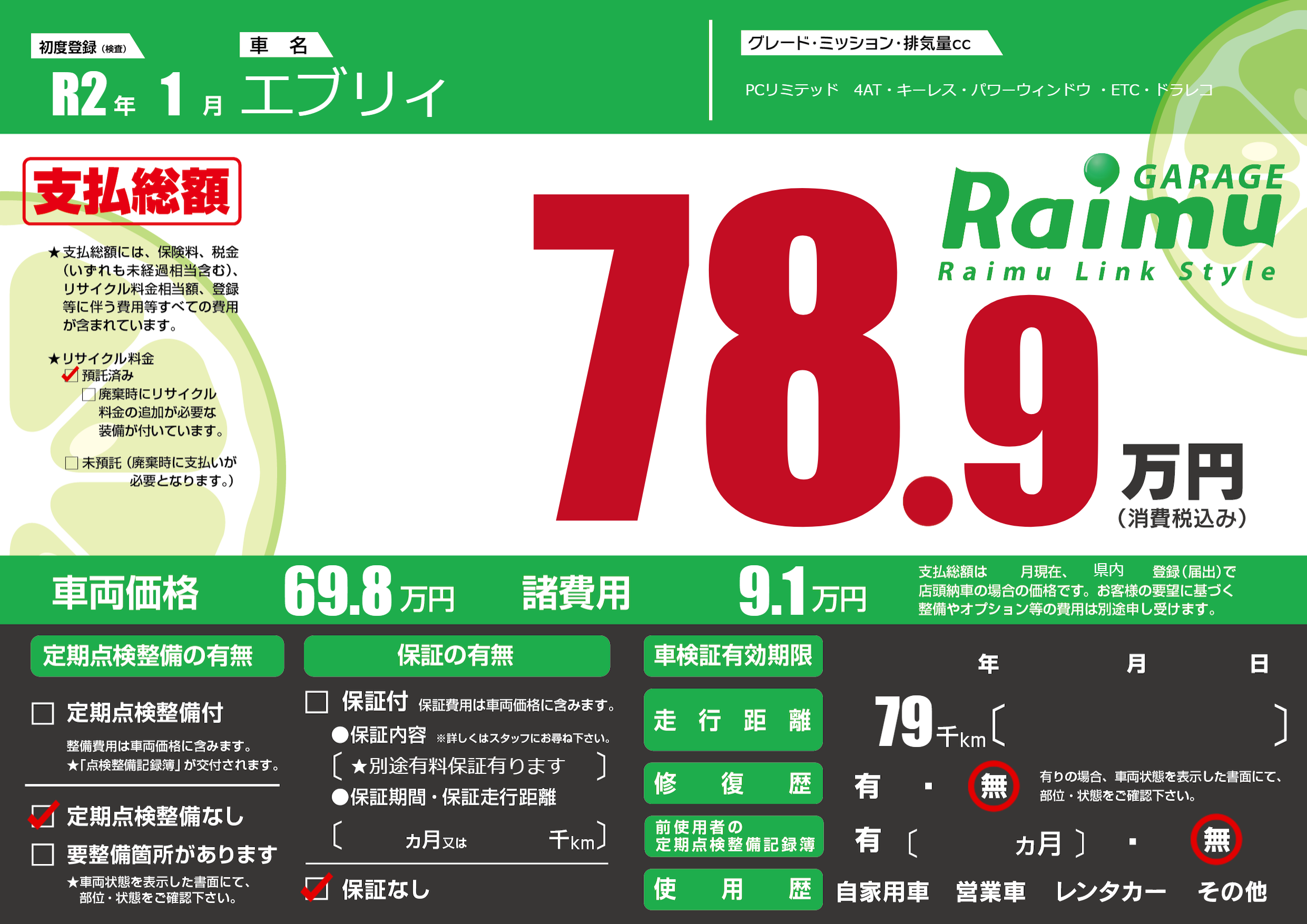 | 車名 | エブリィ | グレード ミッション 排気量 |