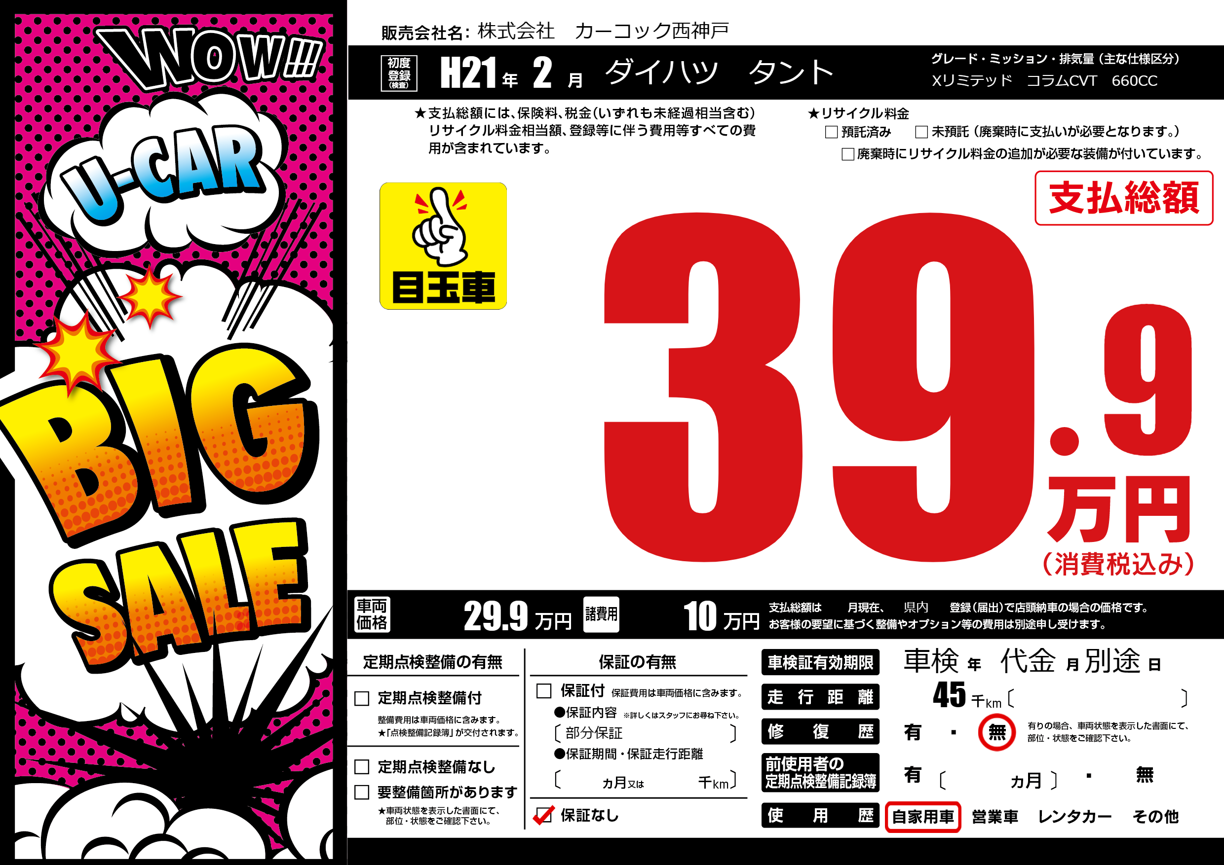 | 車名 | ダイハツ タント | グレード ミッション 排気量 |