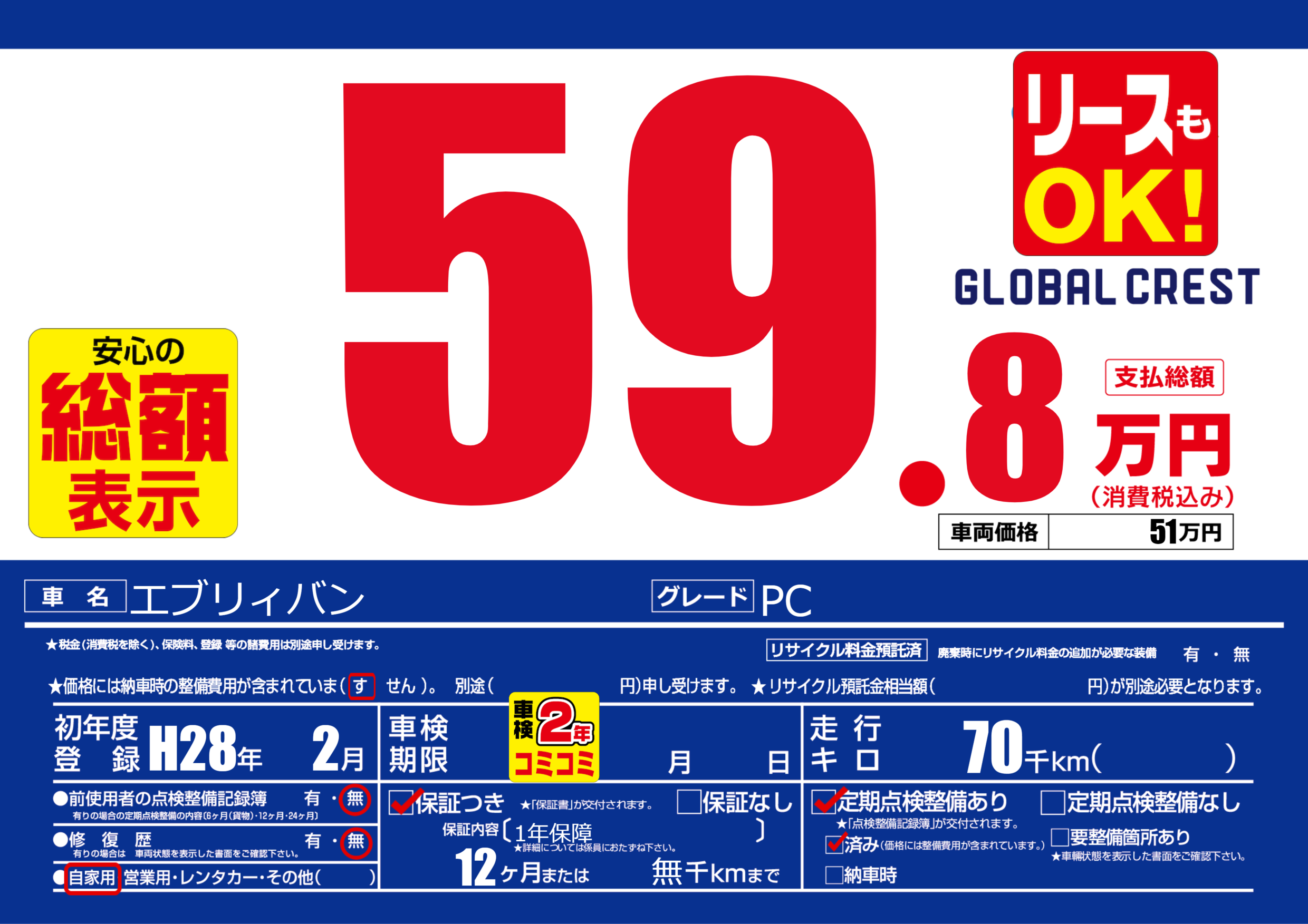 | 定期点検整備 | 定期点検整備あり 定期点検整備済み | ||