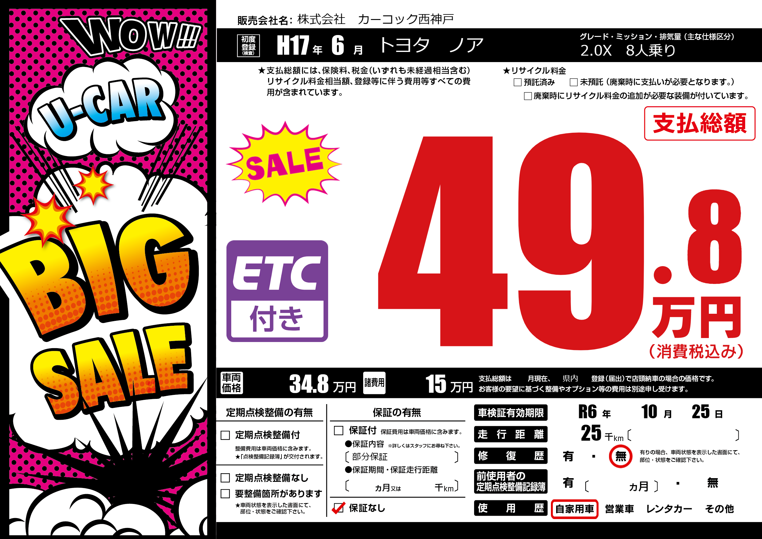| 車名 | トヨタ ノア | グレード ミッション 排気量 |