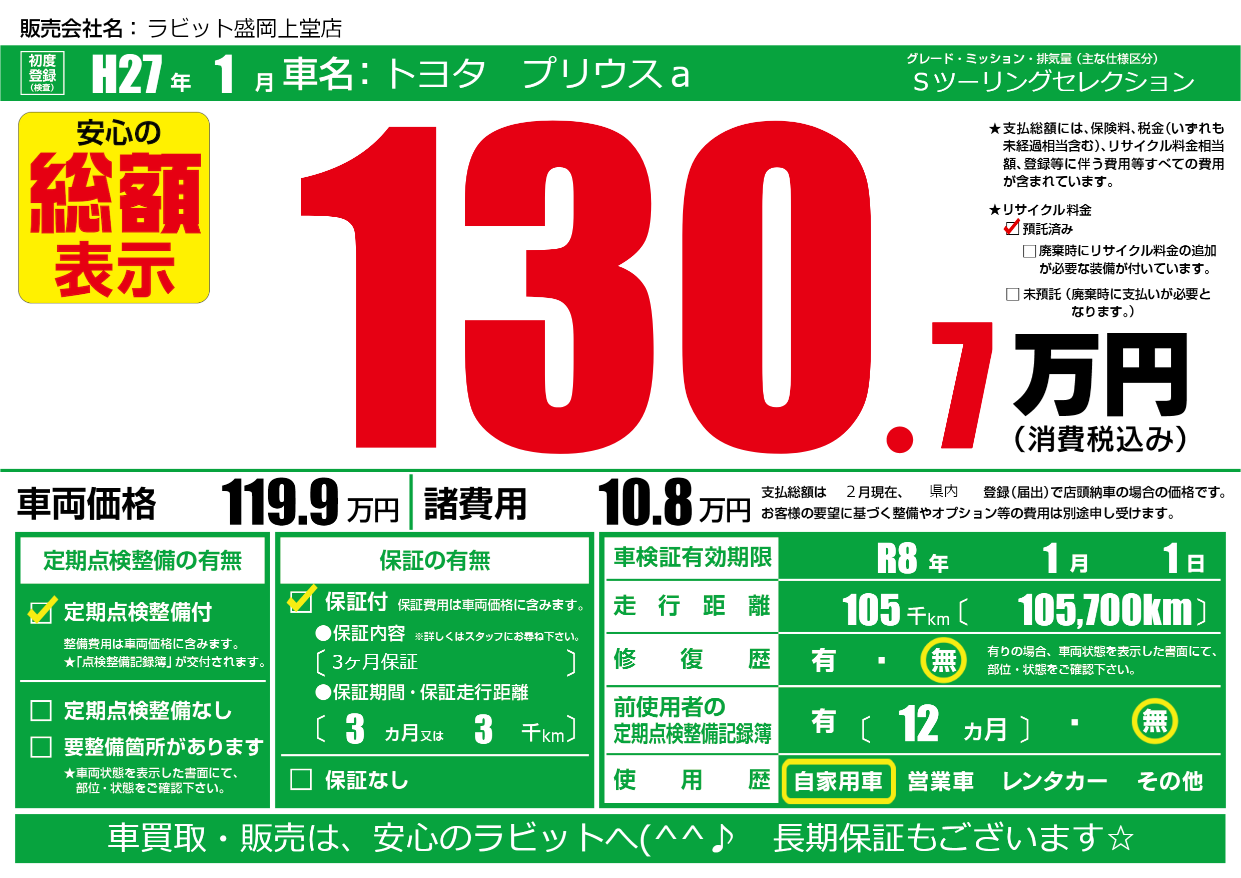 | 車名 | トヨタ プリウスa | グレード ミッション 排気量 |