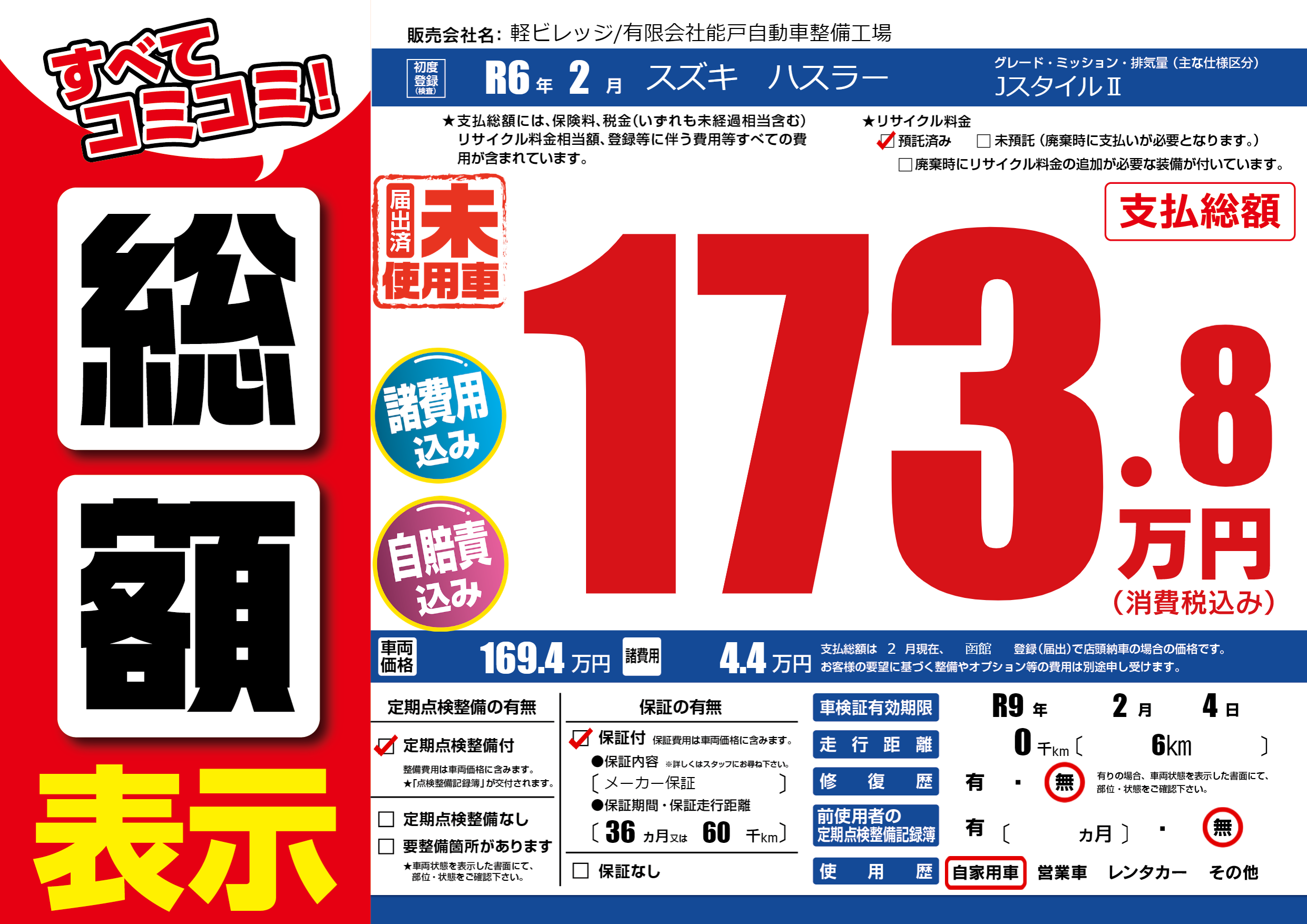 | 車名 | スズキ ハスラー | グレード ミッション 排気量 |