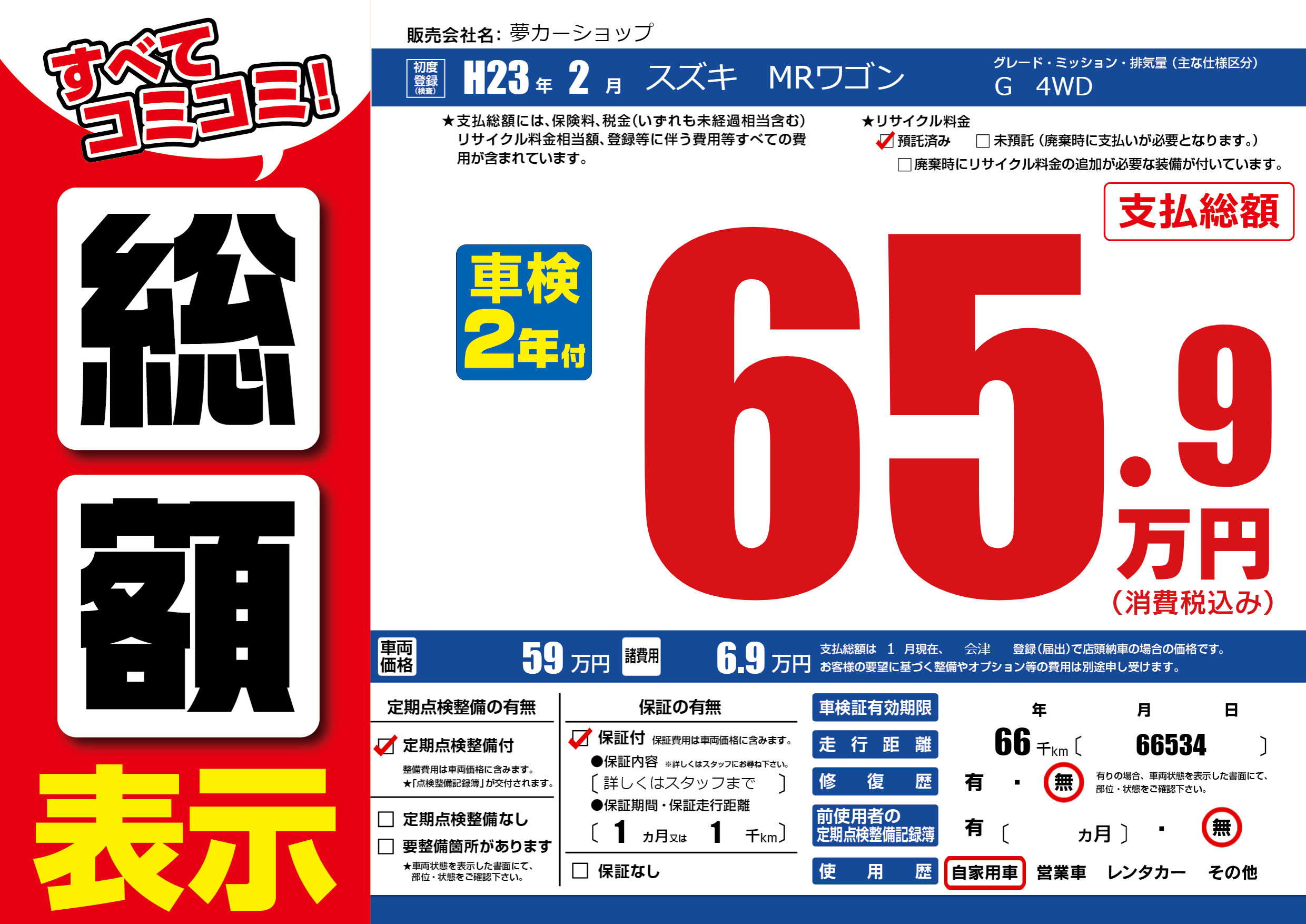 | 走行キロ | 6.6万km | 初年度登録 | H23年2月 |